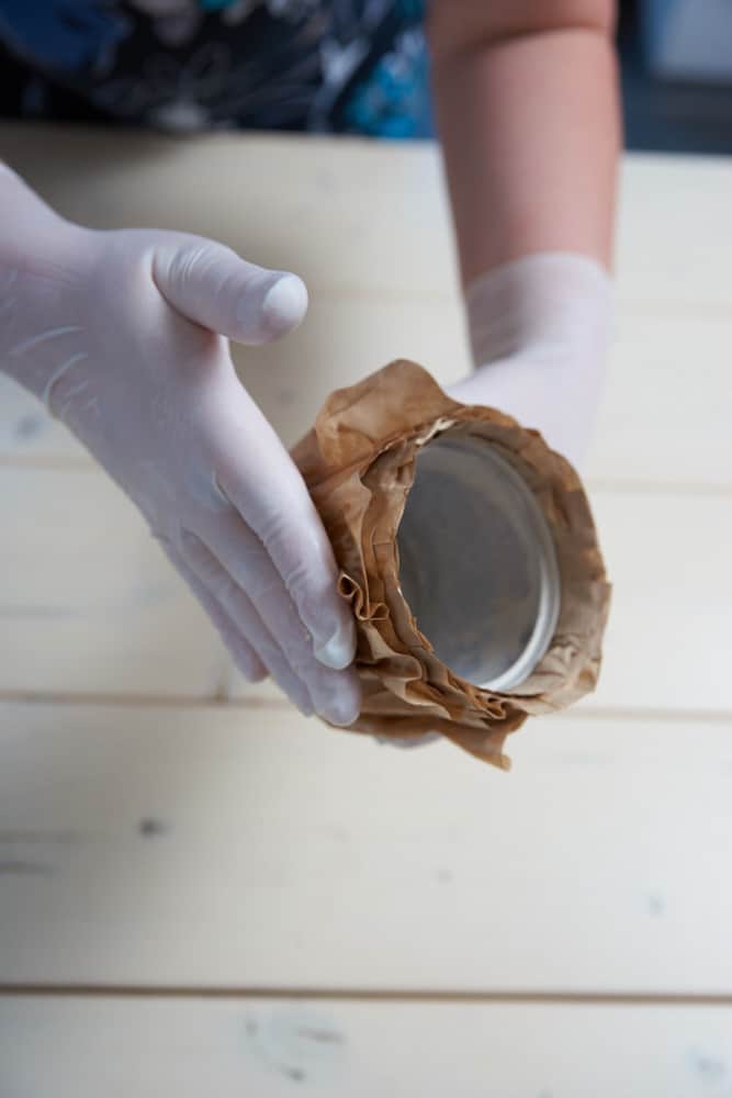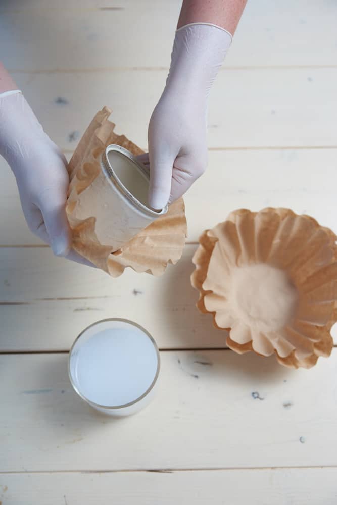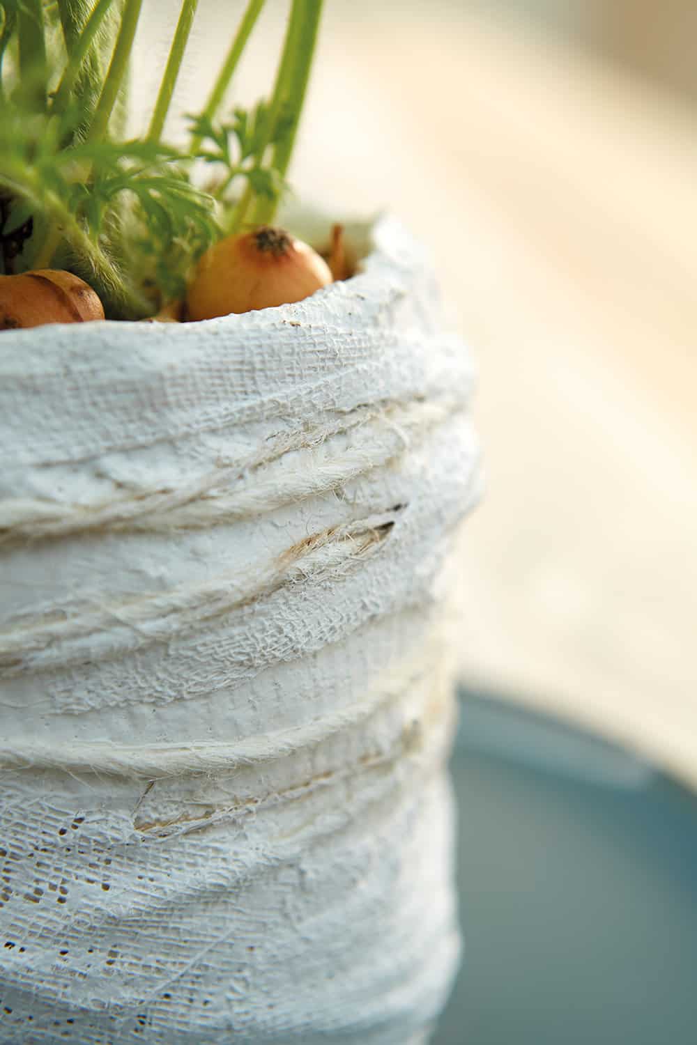 Blechdose mehrschichtig mit eingekleisterten Kaffeefiltern umhüllen. Nach dem Trocknen das Gefäß bepflanzen und feine Zweige hinzustecken, die die Farbe des Filterpapers aufgreifen.