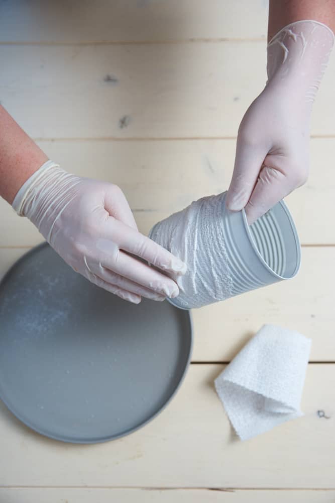 Blechdose mit Gipsbinden umwickeln und dabei Dochtfaden einarbeiten. Nach dem Trocknen das Gefäß mit weißer Farbe bestreichen, wodurch die Blütenfarbe wiederholt wird.