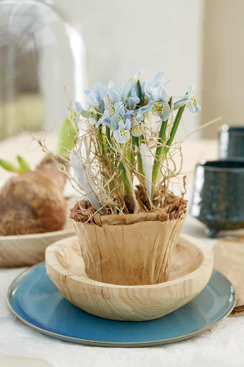 Maulbeerbaumrinde (Lino), Teller (Serax), Blechdosen, Kleister, Heißkleber (Oasis)