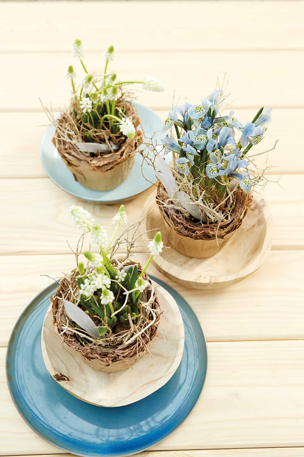 Weiße und pastellfarben helle Frühlingsblüten wirken besonders leicht. Am besten gestaltet man die passend schwerelos erscheinenden Gefäße gleich selbst! Wir zeigen euch hier dieses leicht zu realisierende Beispiel: