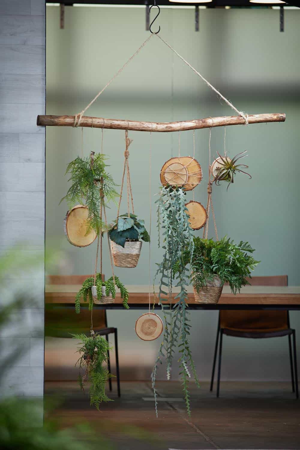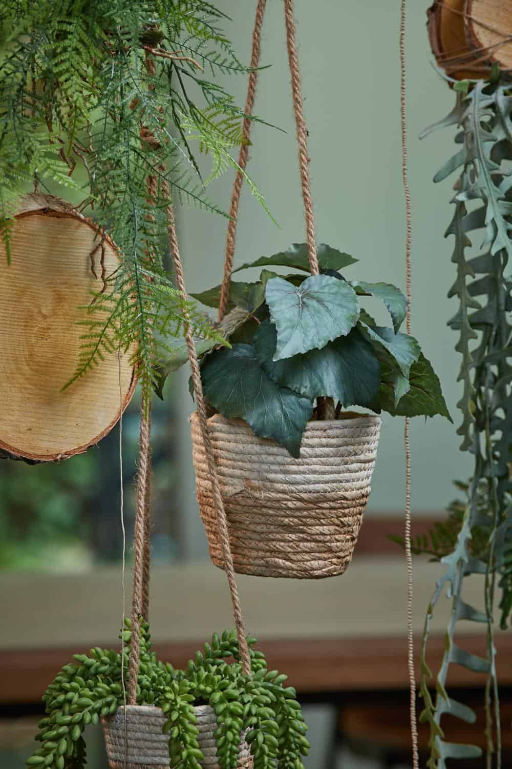 Für das Pflanzenmobile werden die künstlichen Pflanzen in Hängekörben eingestellt oder auf Baumscheiben gewickelt angehängt.