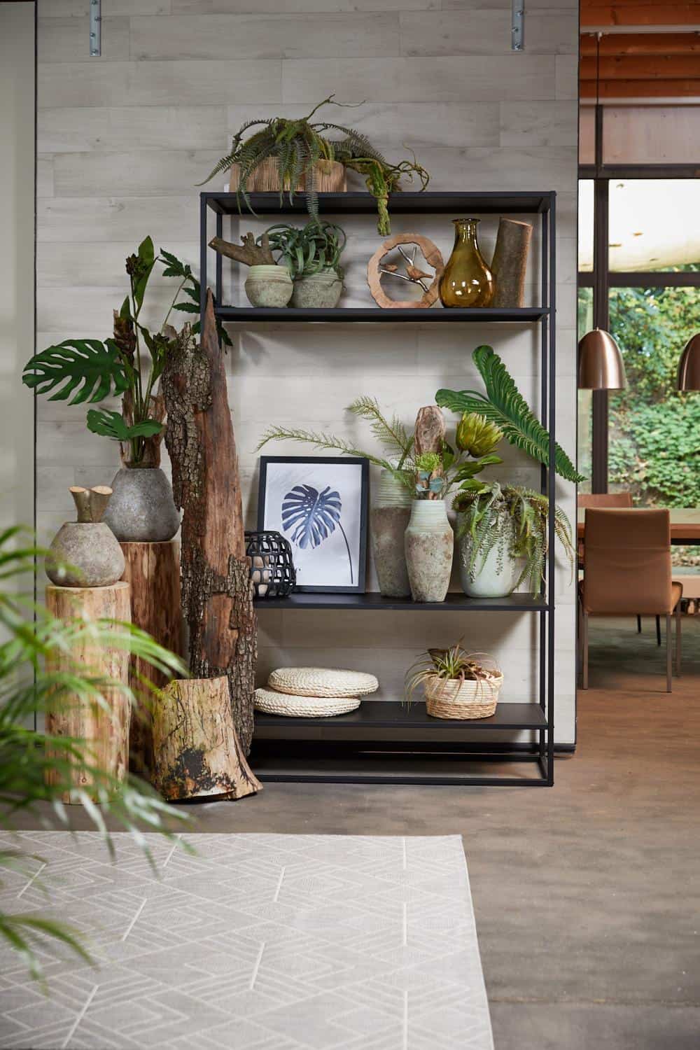 Die künstlichen Pflanzen lassen sich ideal kombinieren mit Vasen- und Gefäßgruppen im Regal oder auf Baumstämmen, die passend zum natürlichen Szenario zur Präsentationsfläche werden