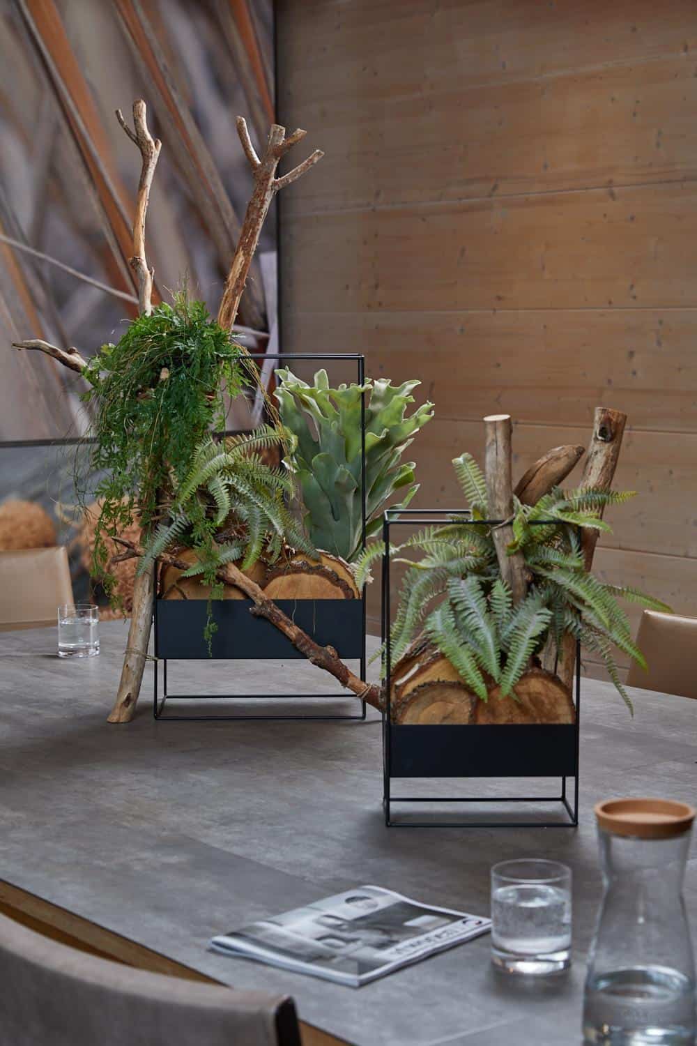 Mehrere senkrecht einstellte Holzscheiben füllen die Kästen der Metallgestelle. Die künstlichen Pflanzen sind eingestellt oder daran aufgehängt