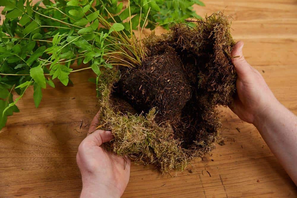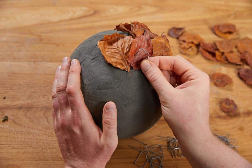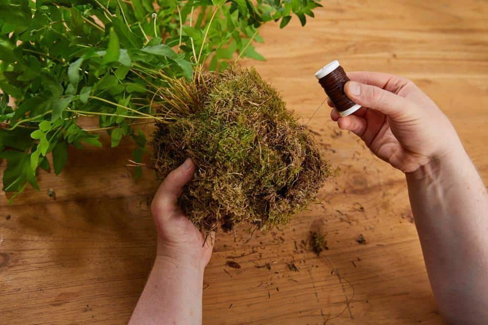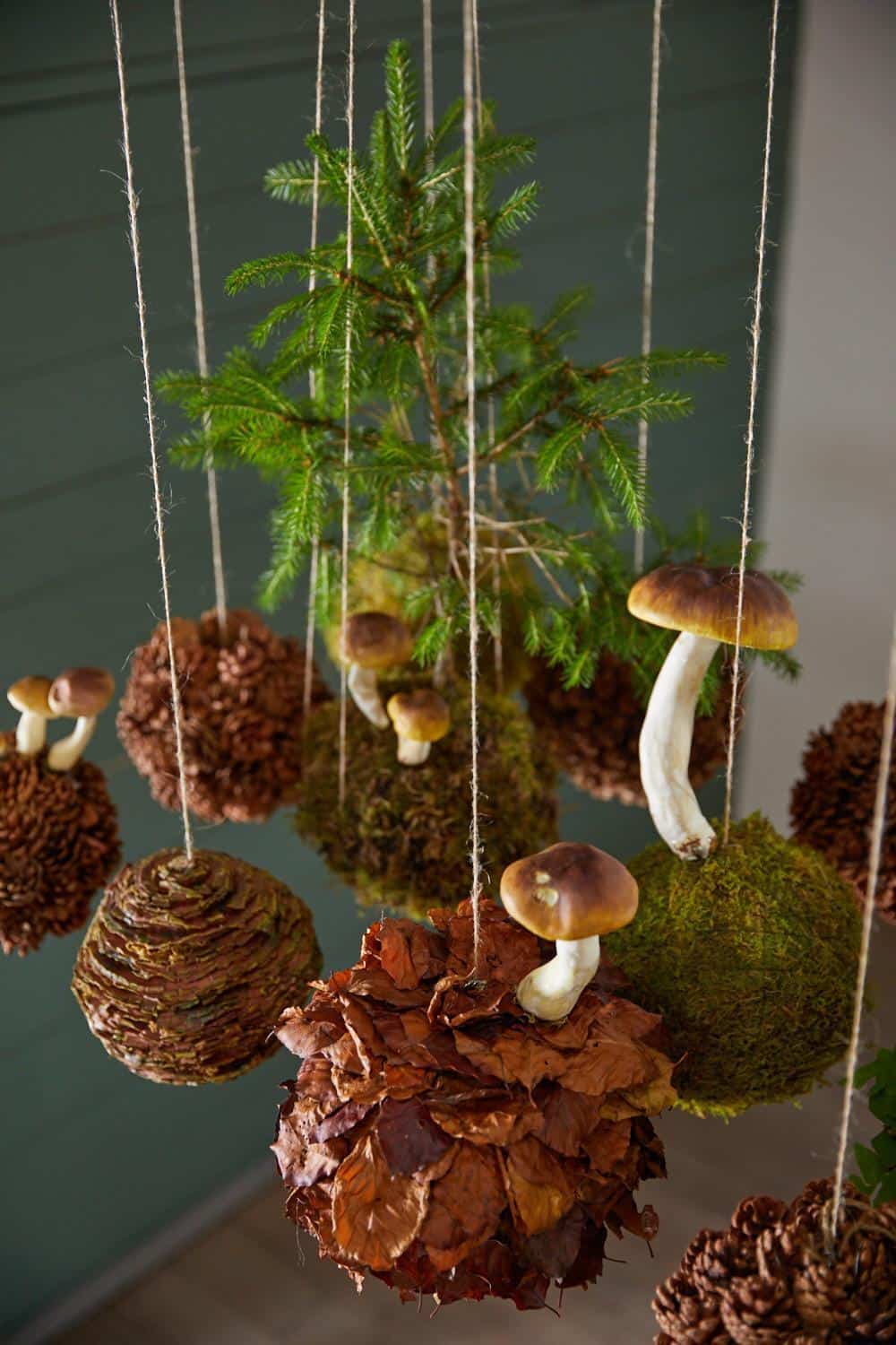 Die Steckschaumkugeln mit Buchenblättern behaften und dabei immer verschiedene Deko-Pilze mit einarbeiten. Den Wurzelballen der Farnpflanzen bzw. den des Fichtenbäumchens mit Moos umwickeln und zum Kokedama gestalten. Dann alle Kugeln mit einer Schnur versehen und auf gleicher Höhe über dem Präsentationstisch aufhängen.