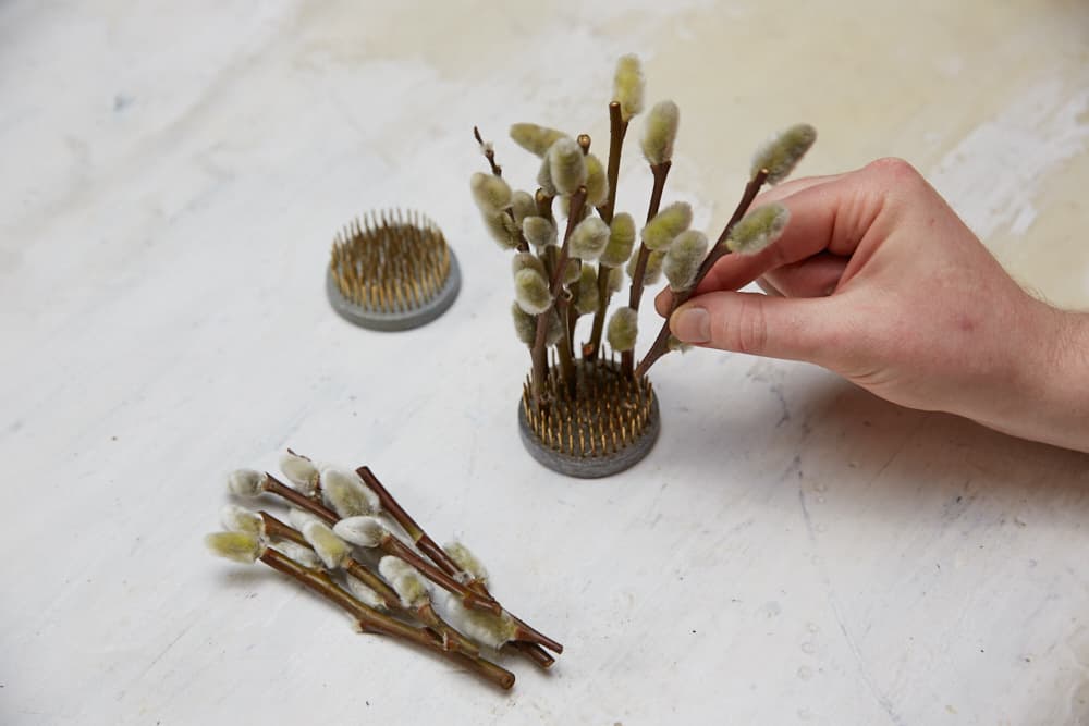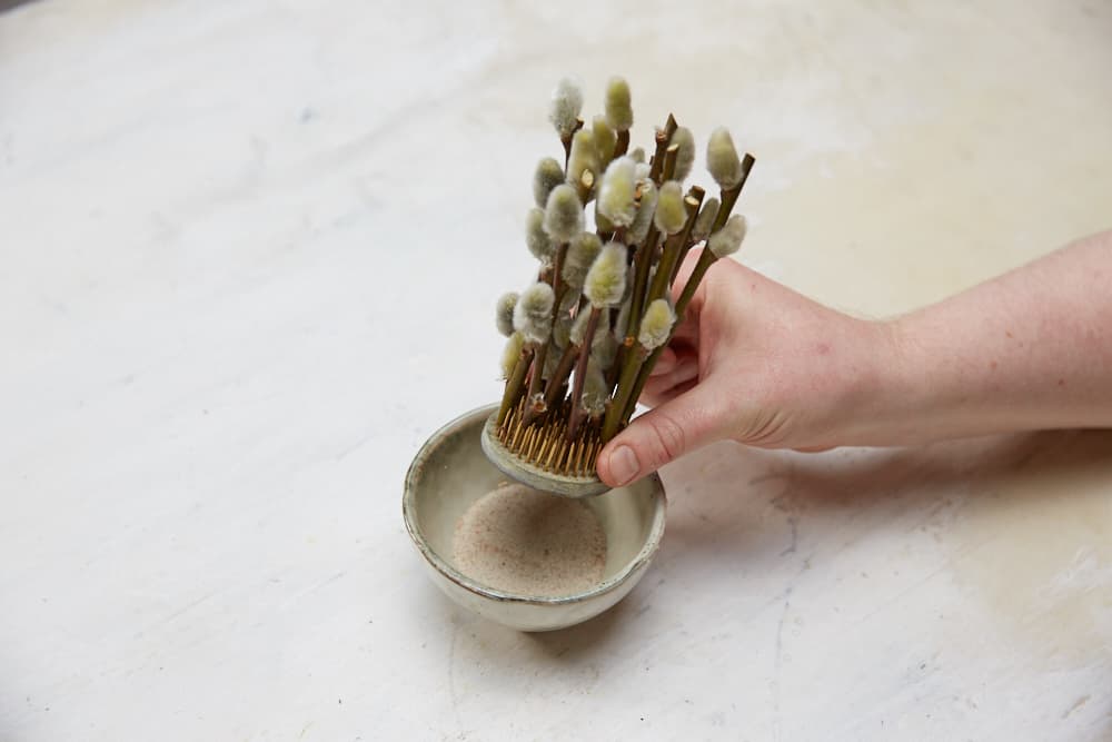 - Boden der Schale mit Sand füllen. Weidenzweige in gewünschte Länge schneiden und dicht an dicht als Basis in den Steckigel stecken.