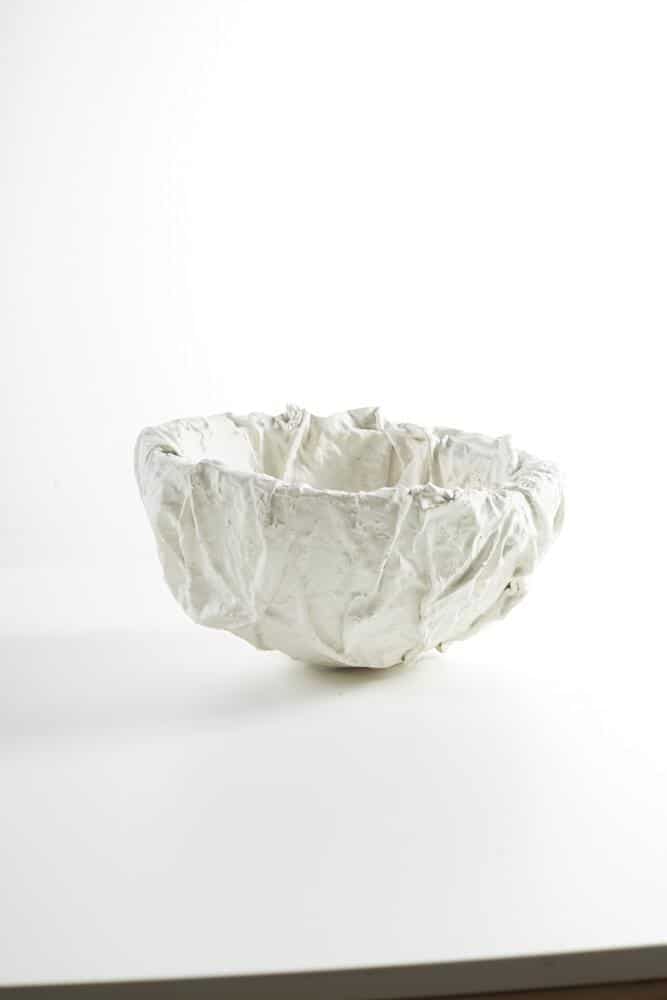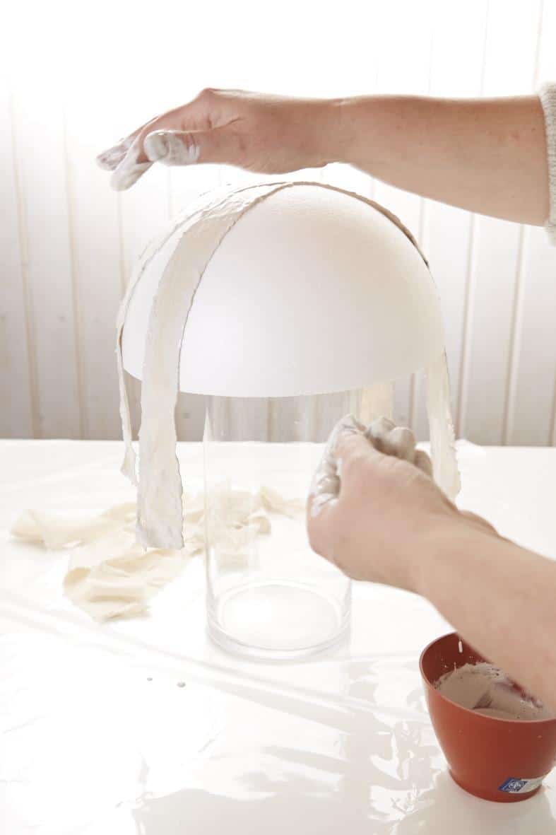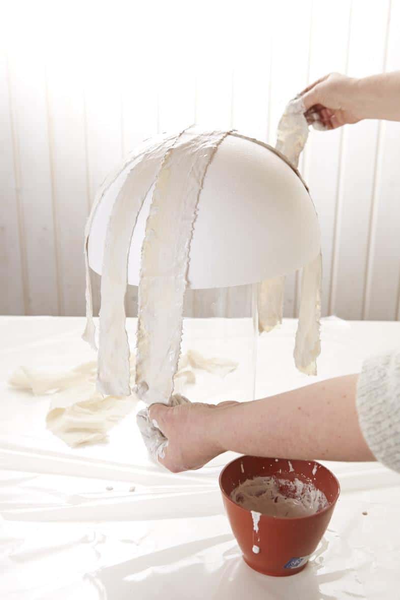 Gips mit Wasser anrühren und die Masse zur Verstärkung mit Holzleim vermischen. Styroporschale auf ein ausreichend hohes Gefäß legen. Dann Stoffstreifen in Gips tunken und nach und nach im Winkel versetzt gegeneinander über die Schale legen. Dann den Gips durchtrocken lassen, bis er sich vollkommen verfestigt hat. Eventuell kann man die Flächen noch durch aufsprühen von Elefantenhaut-Spray gegen Feuchtigkeit schützen.