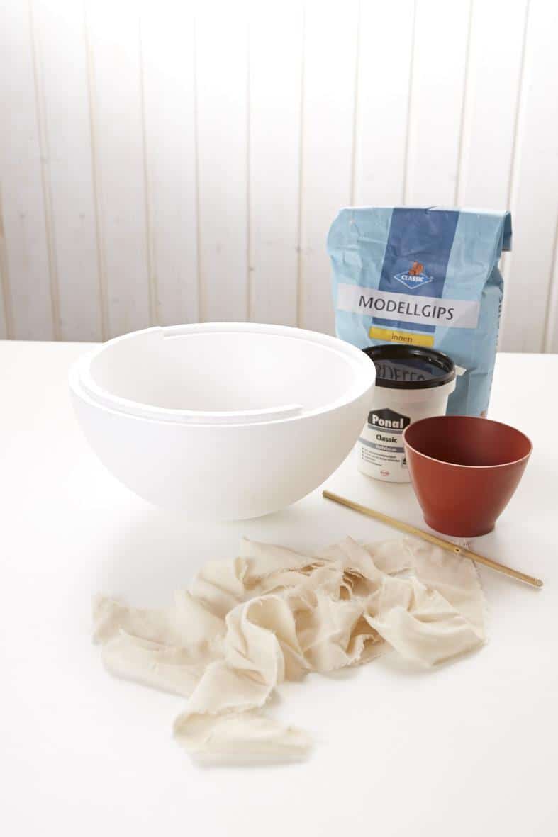 Mehr braucht es nicht, um ein Gefäß nach eigenen Vorstellungen zu fertigen: eine hohle Styropor-Halbkugel, Gips, Holzleim, Stoffstreifen sowie ein Rührgefäß mit Rührstock und natürlich Wasser.