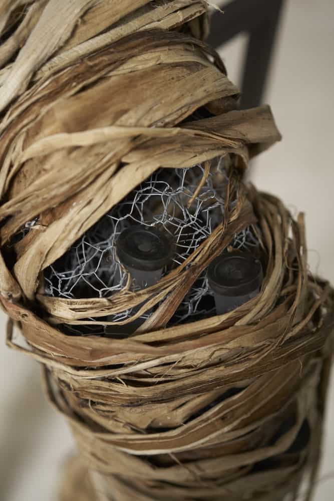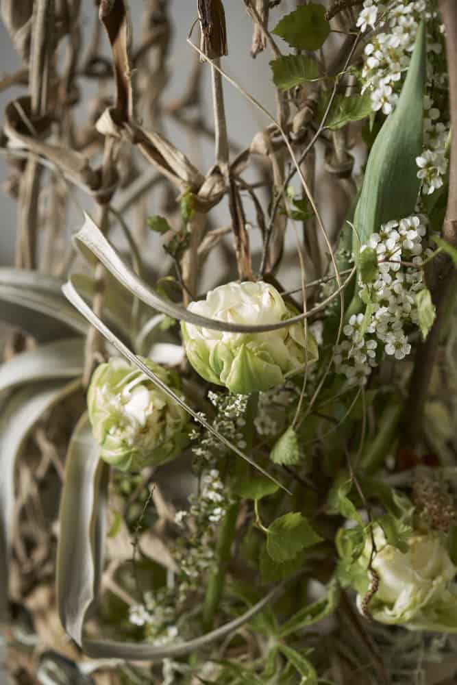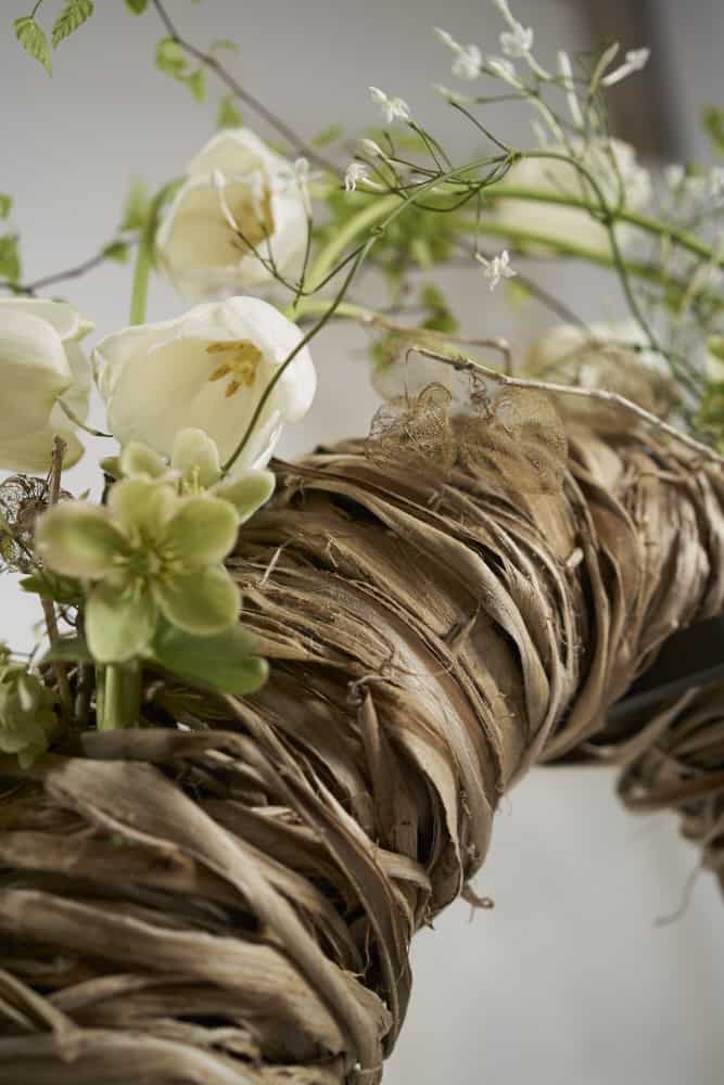 Räumliche Formen, wie hier die aus Kaninchendraht erstellte lange Röhre bzw. Girlande, lassen sich leicht mit den Fasern des Maulbeerbaums umwickeln und erhalten so eine pflanzlich-natürlich wirkende Oberfläche. Punktuell lassen sich dann florale Akzentuierung einarbeiten. In diesem Fall mittig und mit weißen, hellen Blüten und Werkstoffen.