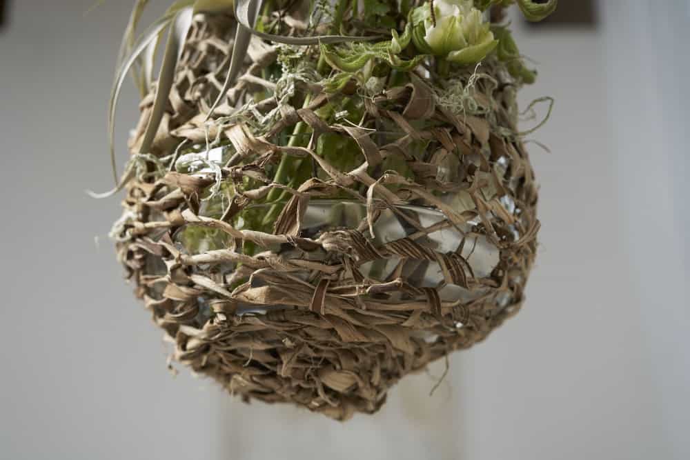 Glasschale in die Aufhängung einlegen, Wasserröhrchen mit Rebenbindedraht befestigen und die Blumen in die Glasschale und das Wasserröhrchen einstellen. Das gefüllte Netz aufhängen, Luftnelke und Zweige mit Rebenbindedraht fixieren und ggf. weitere farbige Maulbeerbaumrinde einarbeiten.