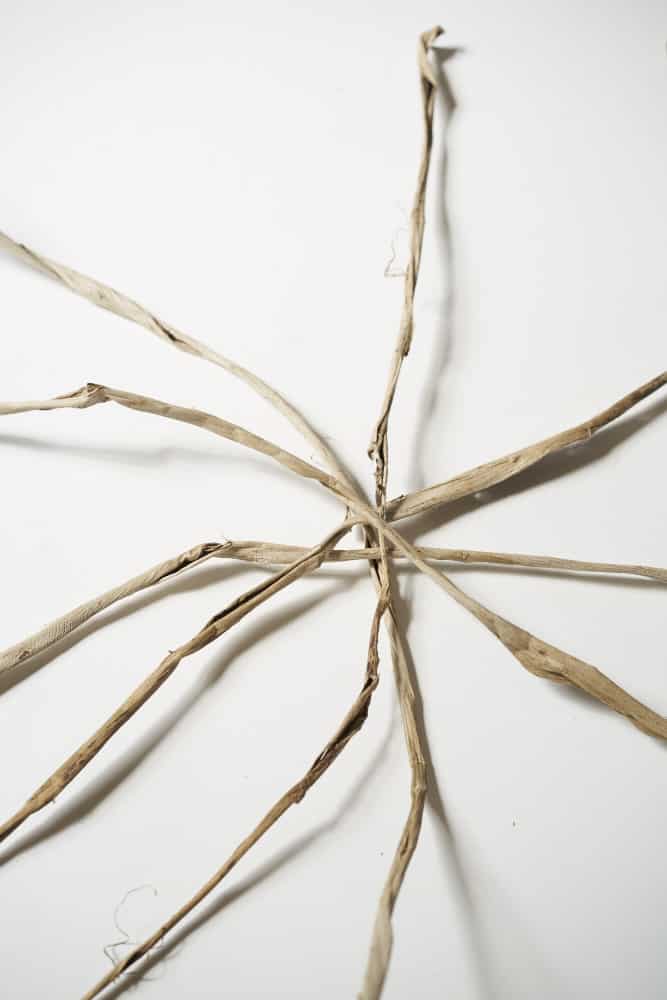 Die Maulbeerbaumrindenstränge in Wasser einweichen. Dann einzelne Rindenstreifen gekreuzt übereinanderlegen. Die Rindenstreifen so miteinander verknoten, dass zuerst die Schnittstelle verknotet ist, dann nacheinander immer zwei Rindenstreifen miteinander verknoten. Das Ganze so lange wiederholen, bis die gewünschte Größe der Aufhängung erreicht ist.