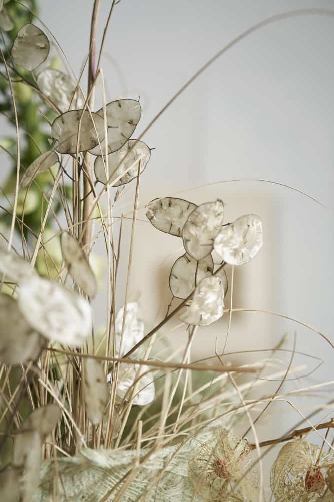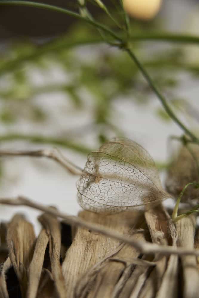 Auch die teiltransparenten, dünnen Matte aus den gebleichten, hellen Fasern des Maulbeerbaums sind floristisch vielseitig einsetzbar. Hier umgeben die zu breiten Bänder gehandelten Matten ein Glasgefäß und bieten zusätzlich außen eingefügten Trockenfloralien entsprechenden Halt. Schön ist, wenn einzelne Fasern, Trockengräser, Ranken oder Fruchtstände ein wenig ausbrechen und damit die Natürlichkeit solch einer Gefäßummantelung zusätzlich unterstreichen.