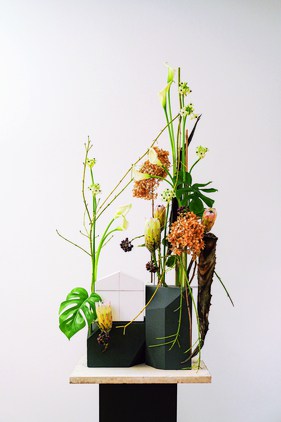 Florist Tino Hoogterp erinnert damit an den expressionistischen Maler Ernst Ludwig Kirchner, der sich als verfolgter Künstler 1938 das Leben nahm. Die Basis bilden zwei OASIS® BLACK IDEAL Zylinder, die miteinander verbunden sind und mit kräftig farbigen, teils exotischen Blumen und Blattwerk besteckt werden.
