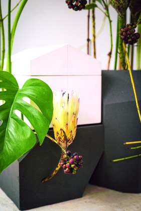 OASIS®BLACK IDEAL Blöcke lassen Bauwerke im Stil des derzeit wieder angesagten Brutalismus entstehen. So mag dies ein Schmuck für einen Architekten sein? Seine Urne findet sich in Weiß daneben, gestaltet von Designerin Lene Jünger. Florist Tino Hoogterp realisiert solch ungewöhnliche Gestaltungen dank der guten Bearbeitbarkeit der schwarzen Steckschaum-Produkte.