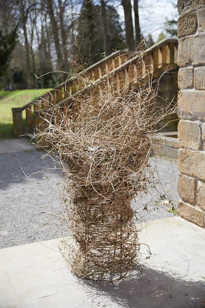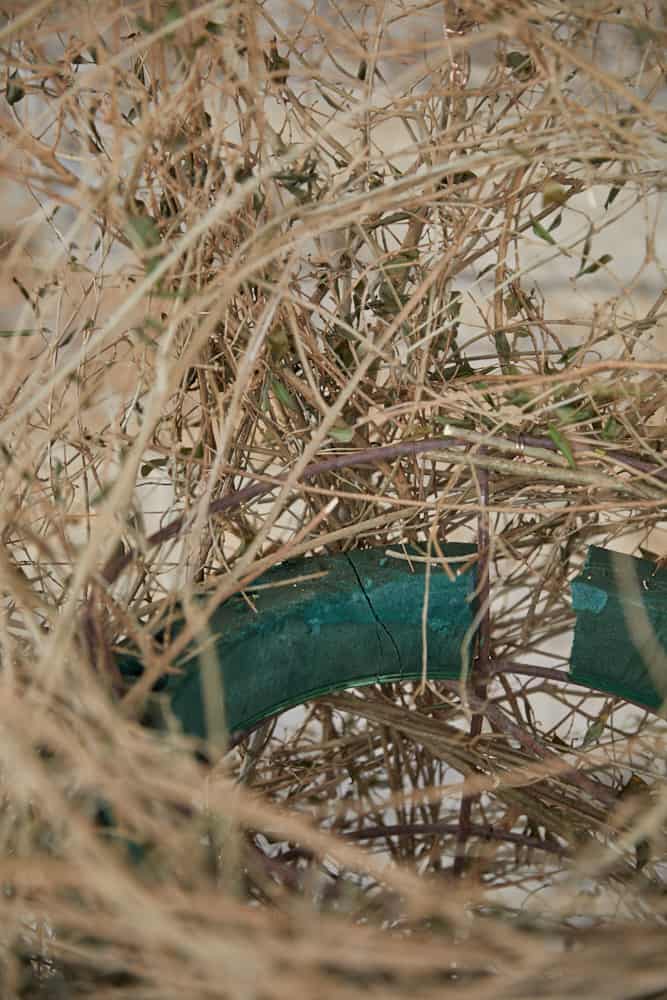 Basis ist das hüfthohe, röhrenartige Metallgestell, das mit Ligusterzweigen und vielen Ranken umlegt ist, die mittels Twistdrahts an selbem fixiert werden. Die Urne steht blickgerecht relativ weit oben und wird noch leicht von den auslaufenden Zweigen sowie den Blumen umspielt. Dazu einen Frischblumensteckschaum-Kranz halbieren, wässern und beide Hälfen im oberen Bereich des Grundgestells mit Wickeldraht befestigen. In gleicher Höhe auch den Holzteller als Ablagefläche für die Urne andrahten. Dann kann der Blumenschmuck eingesteckt und die Urne platziert werden. Der Zusatzaspekt: Wird der Frischblumensteckschaum-Kranz als Steckbasis für die frischen Blüten ausgewechselt, lässt sich auch diese Rankensäule erneut verwenden. Diese Rankensäule könnt ihr je nach Saison mit den verschiedensten Pflanzenteilen als auch Schnittblumen versehen und an die Wünsche euer Kunden optimal anpassen.