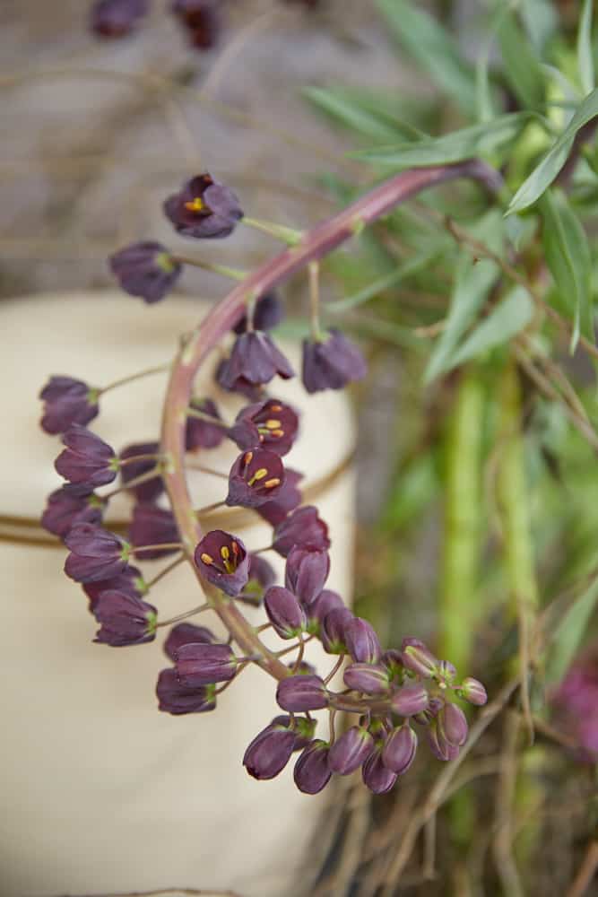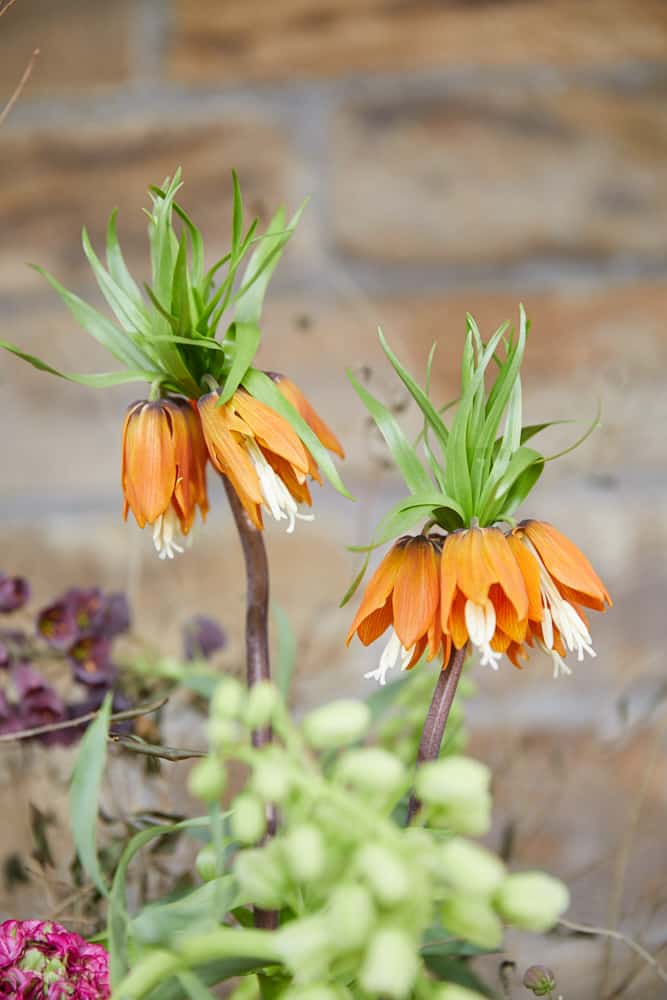 Persische Kaiserkrone – Fritillaria persica, Kaiserkrohne – Fritillaria imperialis ‚Orange Beauty‘, Ranunkel – Ranunculus asiaticus, Ligusterzweige – Ligustrum vulgare