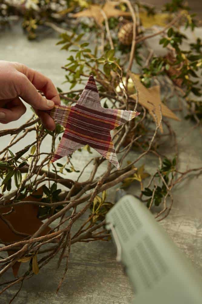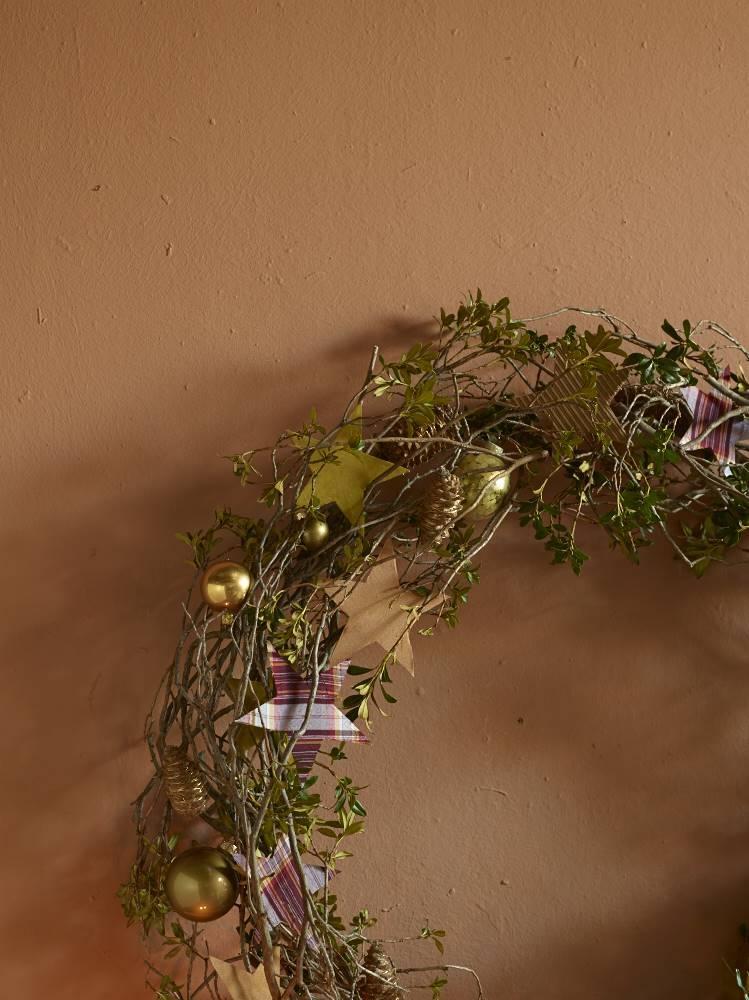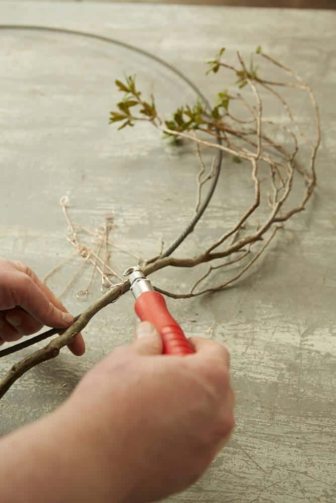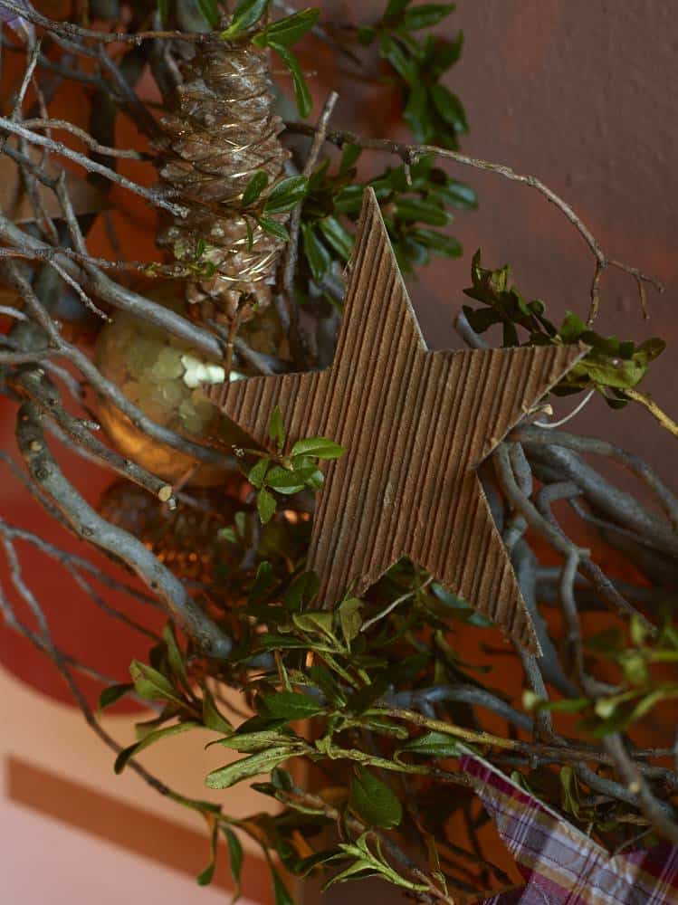 Die Zweige sind locker mittels Twistdraht zu einem Ring zusammengefügt. Die Zapfen mit Zierdraht mehrmals umwickeln, in den Kranz einfügen und die übrigen Accessoires ebenfalls einarbeiten.