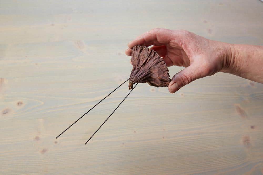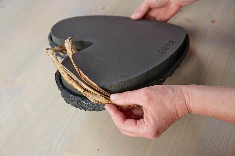 Das Frischblumensteckschaum-Herz wässern, zur Hälfte mit Maulbeerbaumrinde umwickeln und mit Efeunadeln fixieren. Lotusfrüchte andrahten. Angedrahteten Lotus in die Unterlage stecken und die übrigen Werkstoffe hinzufügen.