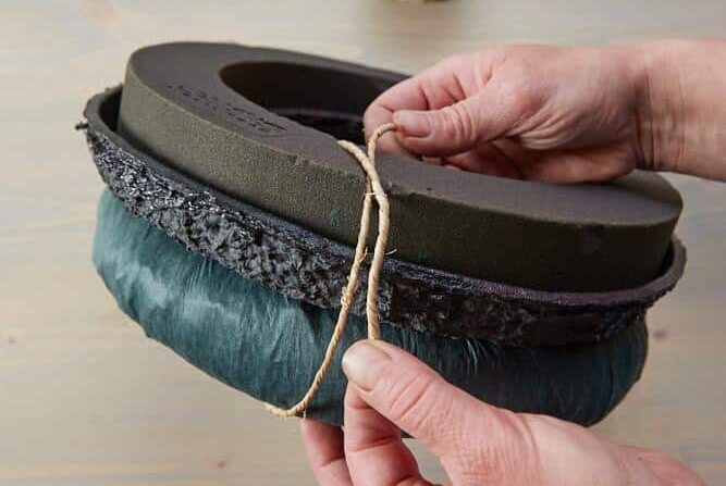 Zuerst den Frischblumensteckschaum-Ring wässern. Dann die Zapfen mit Steckdraht andrahten und in den Ring stecken und einen Freiraum lassen. Diesen Freiraum mit Floralien stecken und Hopfenranken über den Kranz locker legen. Zum Schluss mit Efeunadeln fixieren.