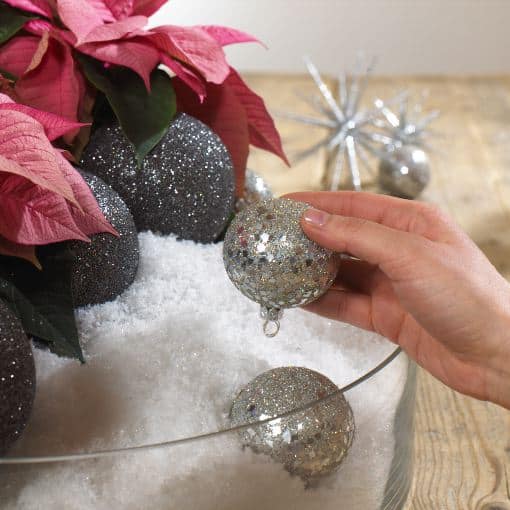 2. Die Glasschale mit Kunstschnee befüllen und einige Weihnachtskugeln, in diesem Fall verschiedene silbern bis anthrazit glitzernde Kugeln zusammen mit einigen silbernen 3D-Sternen, ergänzen.