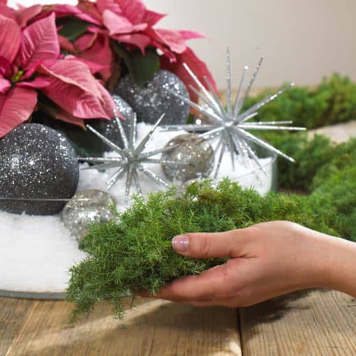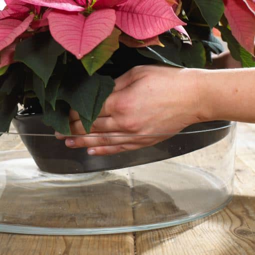 1. Die mit drei bis fünf Weihnachtssternen bepflanzte Schale wird asymmetrisch in eine deutlich größere, sehr weite zylindrische Glasschale mit einem kleinen Rand gestellt.