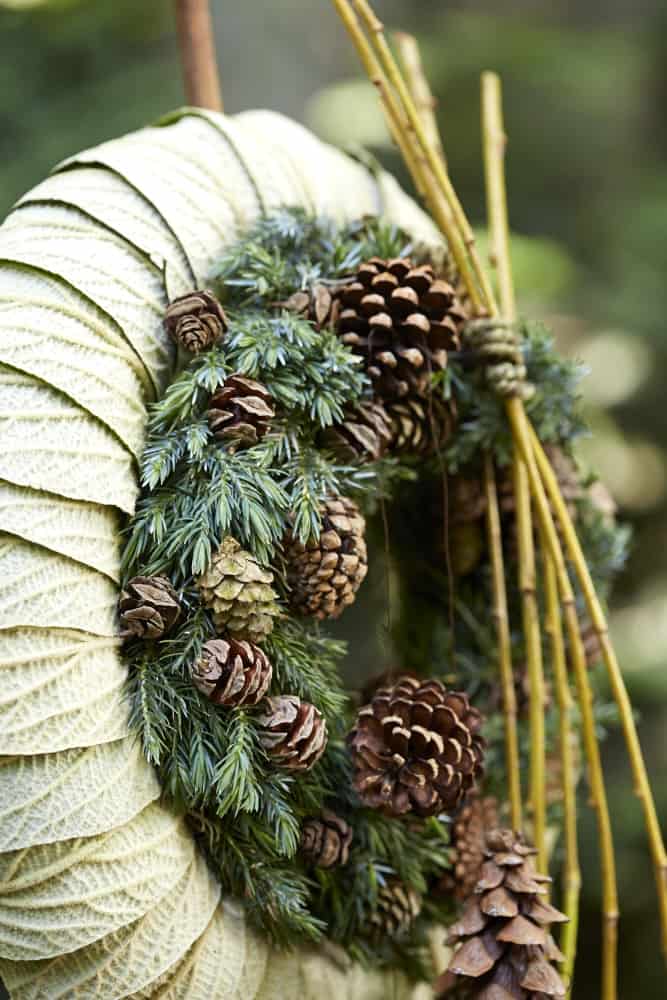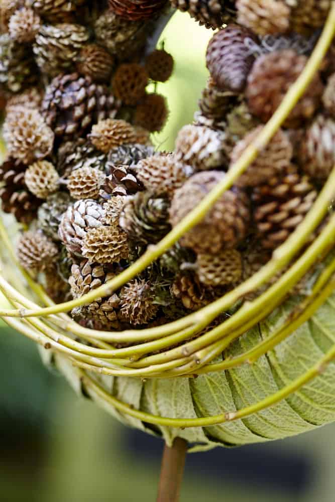Den Polystyrol Ring einmal vertikal durchbohren, um dann den Gartenstecker durchzuziehen. Die Schneeballblätter mit der Unterseite nach oben auf den Ring kleben. Den Steckschaum-Ring mit den angedrahteten Zapfen bestecken und mithilfe von Steckdraht in dem Blattring fixieren. Die oberen kleinen Zapfen mit Heißkleber befestigen. Trauerweide zum Kranz winden, oben auf den Ring legen und ebenfalls mit Steckdraht fixieren. Zum Schluss an dem Gartenstecker anbringen.