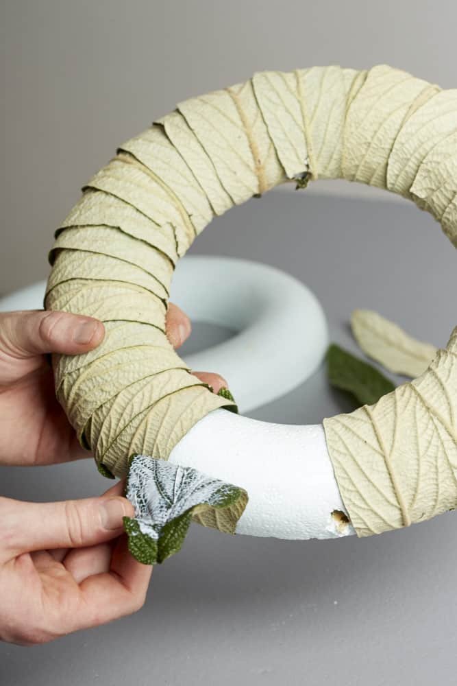 Dann die Blätter auf den Polystyrol-Ring kleben.