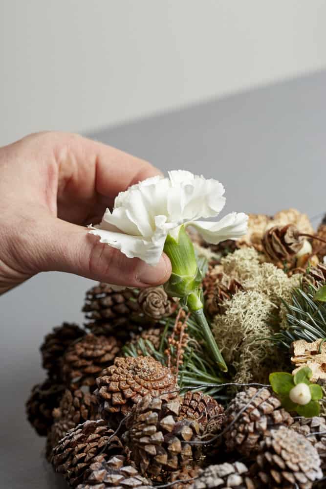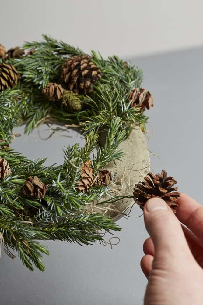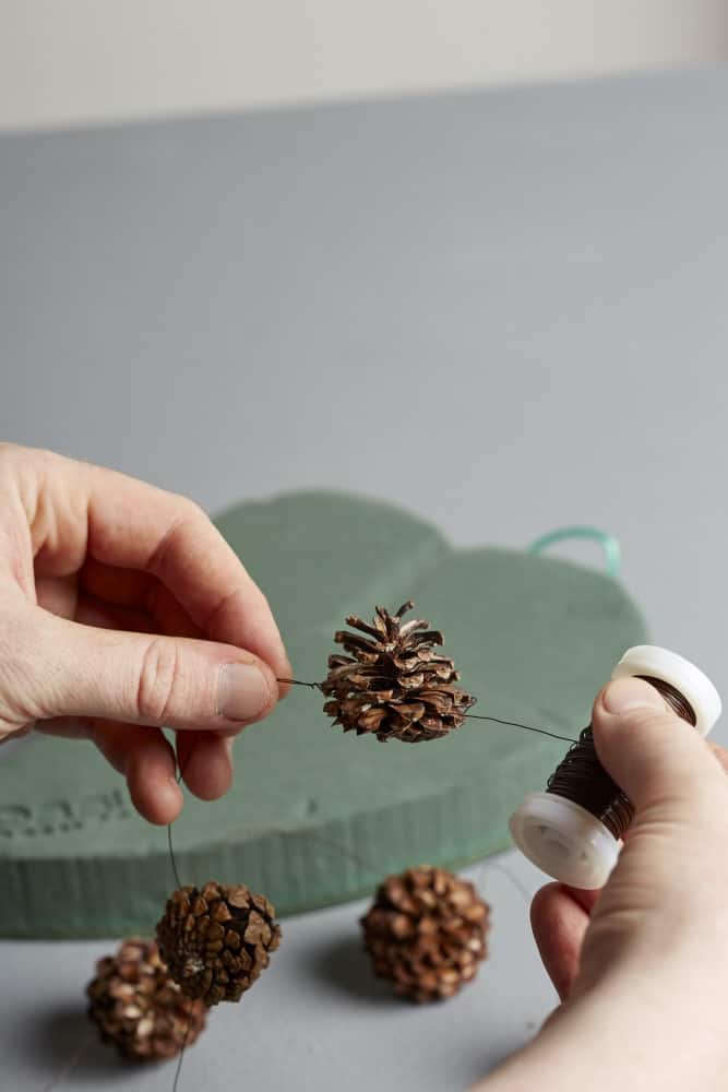 Kiefernzapfen mit Myrtendraht zu einer langen Girlande auffädeln und die Steckbasis damit umwickeln. Girlande hier und da mit Drahthaken fixieren.