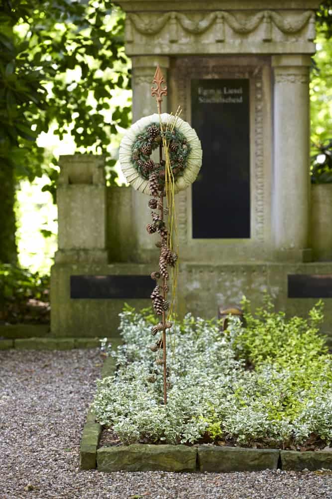Manchmal ist bereits das Grab so dicht und vollständig bepflanzt, dass kein zusätzlicher Gedenkschmuck darauf Platz findet. Hier können Gedenkstecke, die sich über die bepflanzte Fläche erheben und somit in einer anderen Ebene eine schöne Wirkung entfalten, eine passende Lösung sein.