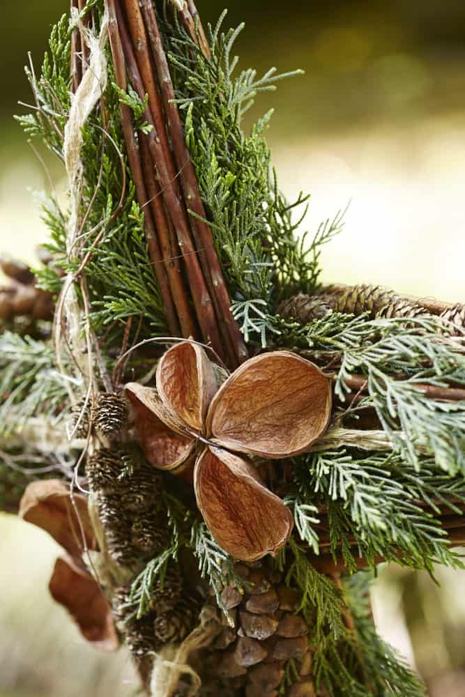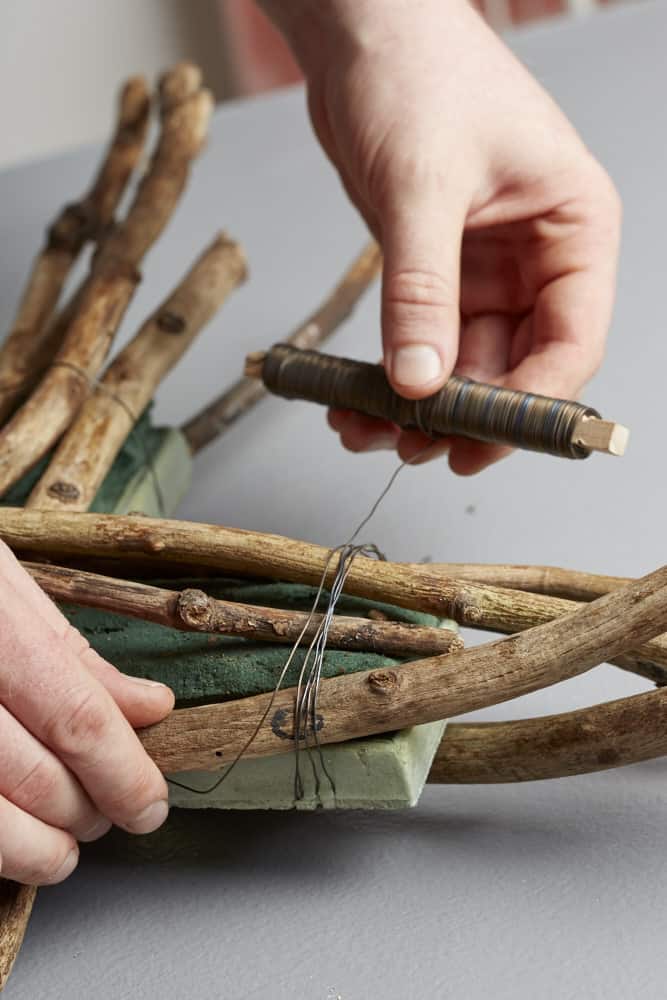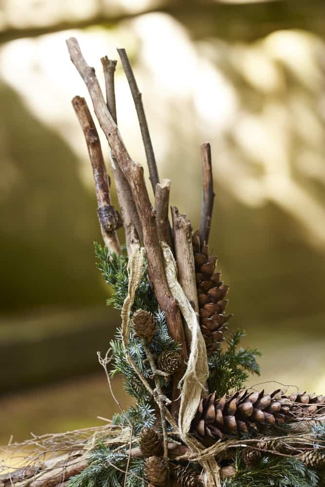 Dann die trockenen Zweige anlegen und mit Wickeldraht fixieren. Maulbeerbaumrinde durchziehen und Wacholder sowie angedrahtete Zapfen einstecken.