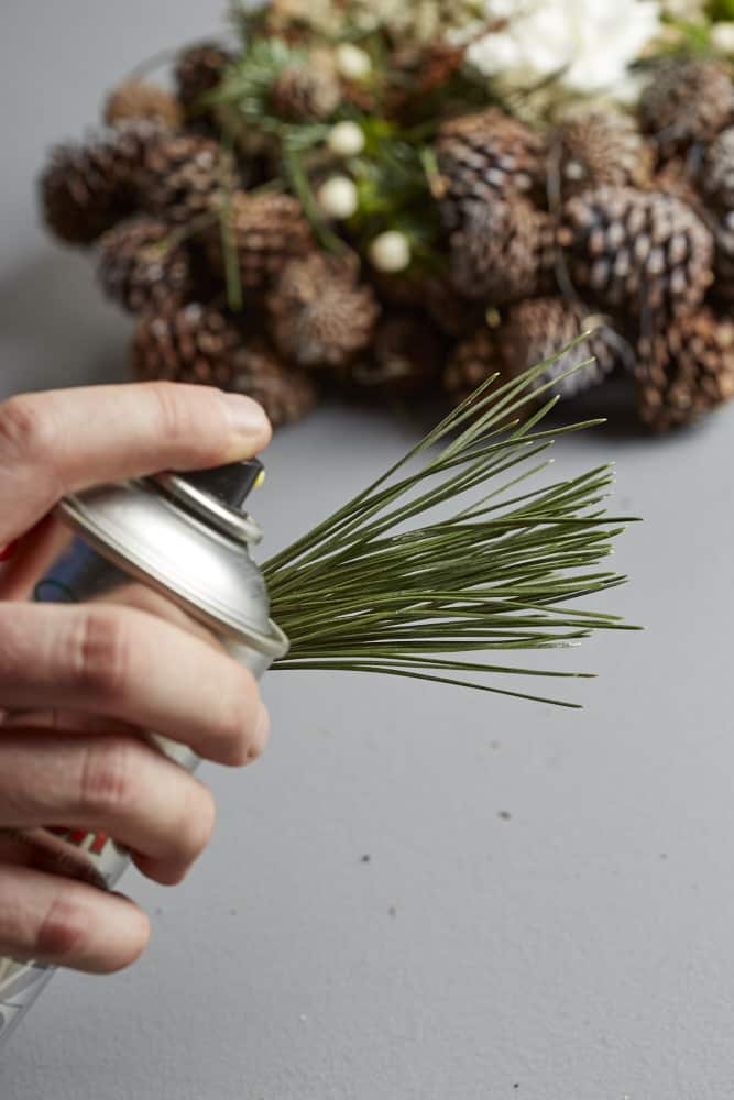 Dann die frischen Floralien zentral einstecken. Kiefernnadeln mit Sprühkleber versehen.
