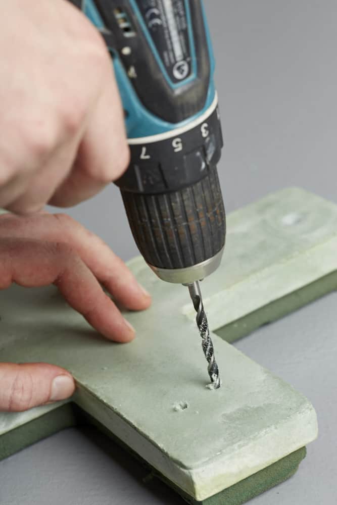 Die Hartschaumunterlage des Frischblumensteckschaum-Kreuzes am oberen und unteren Ende je zweimal durchbohren.