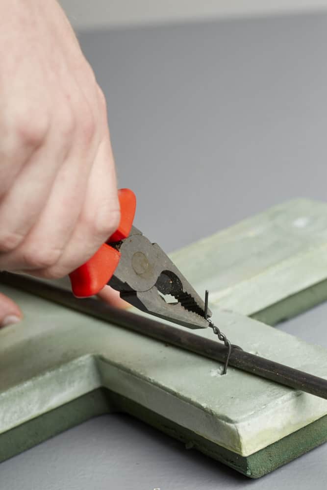 Steckdraht durch die Löcher ziehen, den Metallstab auflegen und den Steckdraht fest verdrehen, ohne jedoch den Hartschaum zu durchschneiden.