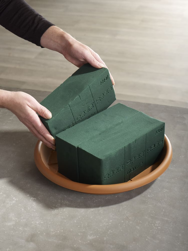 Die gewässerten Frischblumensteckschaum-Ziegel werden auf einen wasserdichten Untergrund gesetzt, hier ist es ein Kunststoffuntersetzer. Sie werden hochkant zu einem rechteckigen Block zusammengestellt, weil die spätere Blumengestaltung volumig ausfallen soll.