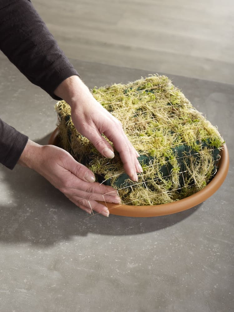 Nun wird der gesamte Steckschaum mit Moos abgedeckt, in diesem Fall ist es das sehr gut Wasser aufsaugende und halten