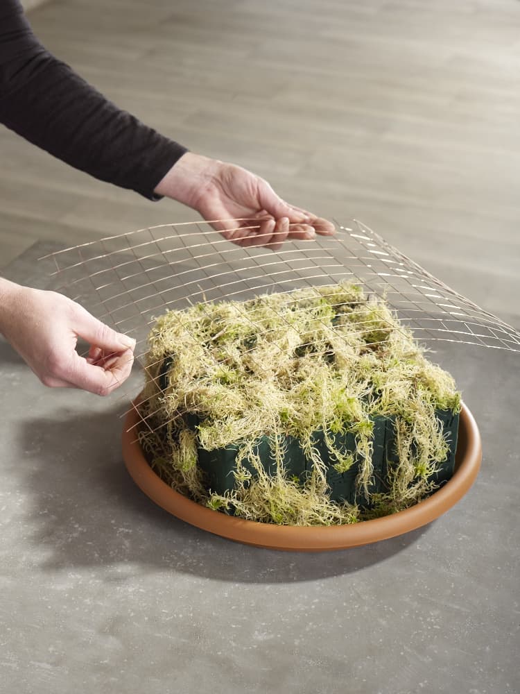 Ein rechteckig zurecht geschnittenes Stück Gitterdrahtgeflecht wird über den Steckschaumblock gelegt und in Form gebogen. Dies muss vorsichtig geschehen, damit einerseits der Steckschaum nicht eingedrückt wird, andererseits sich aber der Draht gut anschmiegt, um diesem Steckschaumblock auch die nötige Festigkeit zu geben. Schließlich soll er das Auseinanderbrechen des Blocks verhindern, wenn die Blumenstiele diesen durchstoßen.