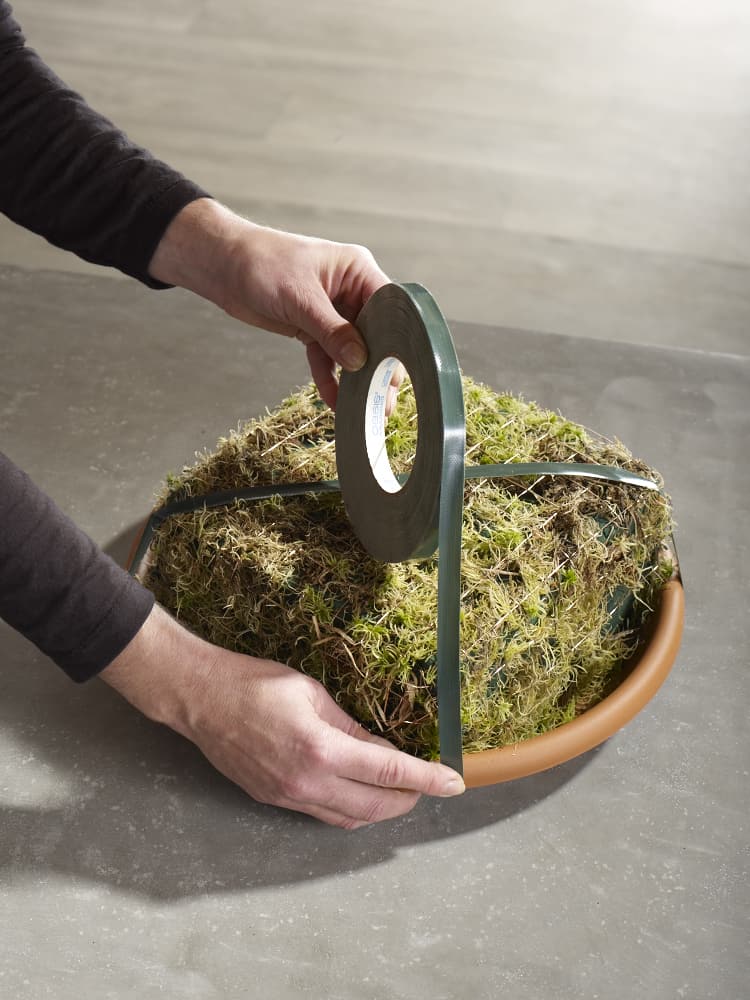 So muss die Steckbasis aussehen: Der Steckschaum ist auf einer wasserdichten Schale fixiert und gut mithilfe von Klebeband zusätzlich verankert. Damit die eingesteckten Stiele später nicht so leicht ausbrechen können, ist der Steckschaum zuvor mit einem Drahtgeflecht versehen, was ihn in sich stabilisiert.