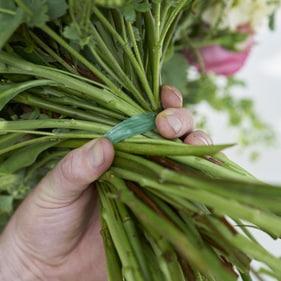 Step 1: Zunächst wird der Strauß soweit gestaltet und erstellt, bis die haltende Hand keine weiteren Werkstoffstiele mehr fassen kann. Dabei ist eine gleichmäßige Stielespirale mit Spreizung entstanden. Jetzt bindet man den Strauß zum ersten Mal und entwickelt eine ordnungsgemäß saubere und schmale Bindestelle. Damit ist das eigentliche Zwischenbinden bereits abgeschlossen.