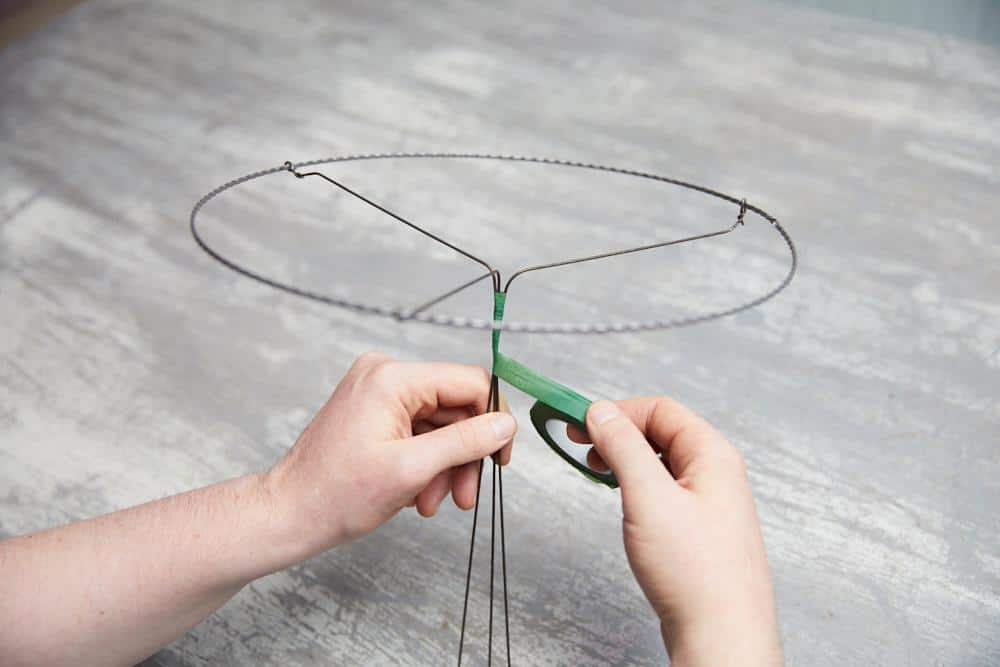 1. Den Wellendrahtring mit drei Steckdrähten versehen und diese zum einem Griff zusammenfassen und mit Floraltape bewickeln.