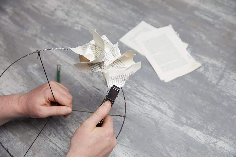 2. Die Buchseiten an den Rändern mit Abtönfarbe verzieren und nach dem Trocknen mithilfe eines Hefters am Wellendrahtring fixieren. Dann den Strauß mit den Floralien in die entstandene Manschette hineingestalten.