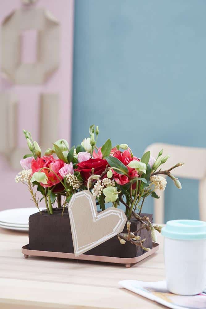 Der Andrang in den floristischen Fachgeschäften ist am Valentinstag besonders hoch, sodass sich Floristen sich perfekt vorbereiten können, in dem sie schnelle Werkstücke erstellen. Dieses Gesteck benötigt nur zwölf Minuten und glänzt durch seine hochwertige Gestaltung. Die Verarbeitung von roten Rosen ist unabdingbar. Bei vielen Kunden ist der Klassiker des Liebesbeweises gewünscht. In dieser Variation werden sie in einer modernen Interpretation gekonnt in Szene gesetzt. In Kombination mit den zarten Blüten von Tulpen, Riceflowers, Schönkelche, Christrosen und den Zweigen von Tulpen-Magnolien verbreiten sie die Liebesbotschaft auf eine beeindruckende Weise. Das dekorative Papierherz ergänzt das Werkstück und drückt Güte, Treue und Gemeinsamkeit aus.