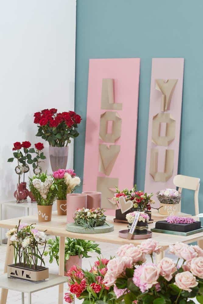 Eine Ladenpräsentation, die sofort ins Auge sticht, lockt potenzielle Kunden in die Geschäftsräume. Die imposanten Buchstaben vermitteln die Botschaft auf eine aussagekräftige Weise. Die schlichte Gestaltung lenkt hingegen die Aufmerksamkeit auf die zu verkaufenden floristischen Exponate. Der Eyecatcher an der Wand oder im Schaufenster weist vom Weiten darauf hin, dass man hier Geschenke für die bessere Hälfte erhält.