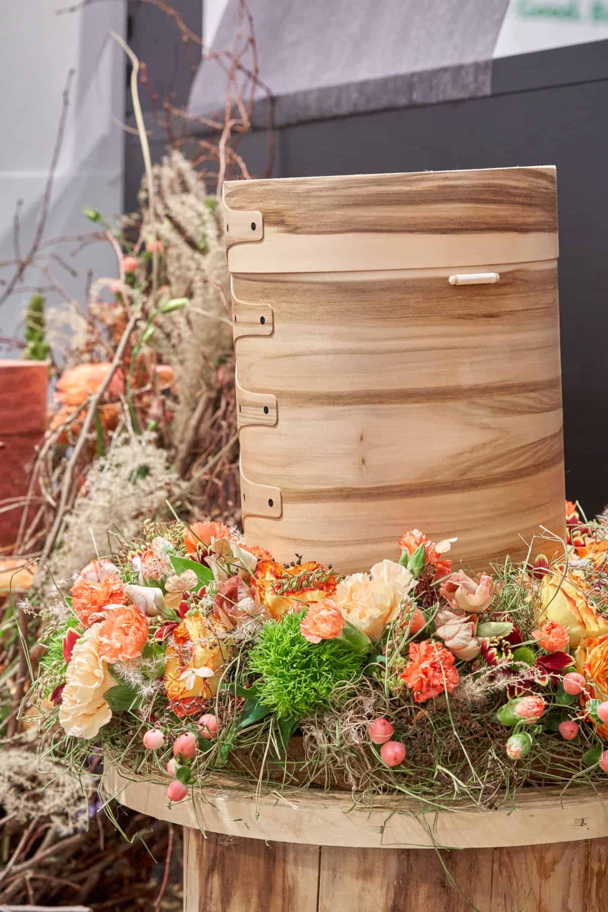 Bis zu 25 Prozent Blumenmenge kann damit, wenn gewünscht, eingespart werden. Außerdem bieten die stabilen anthrazitfarbenen Holzböden eine stabile Grundfläche für die zu ergänzenden Kerzen, Urnen oder anderen Bestandteile.