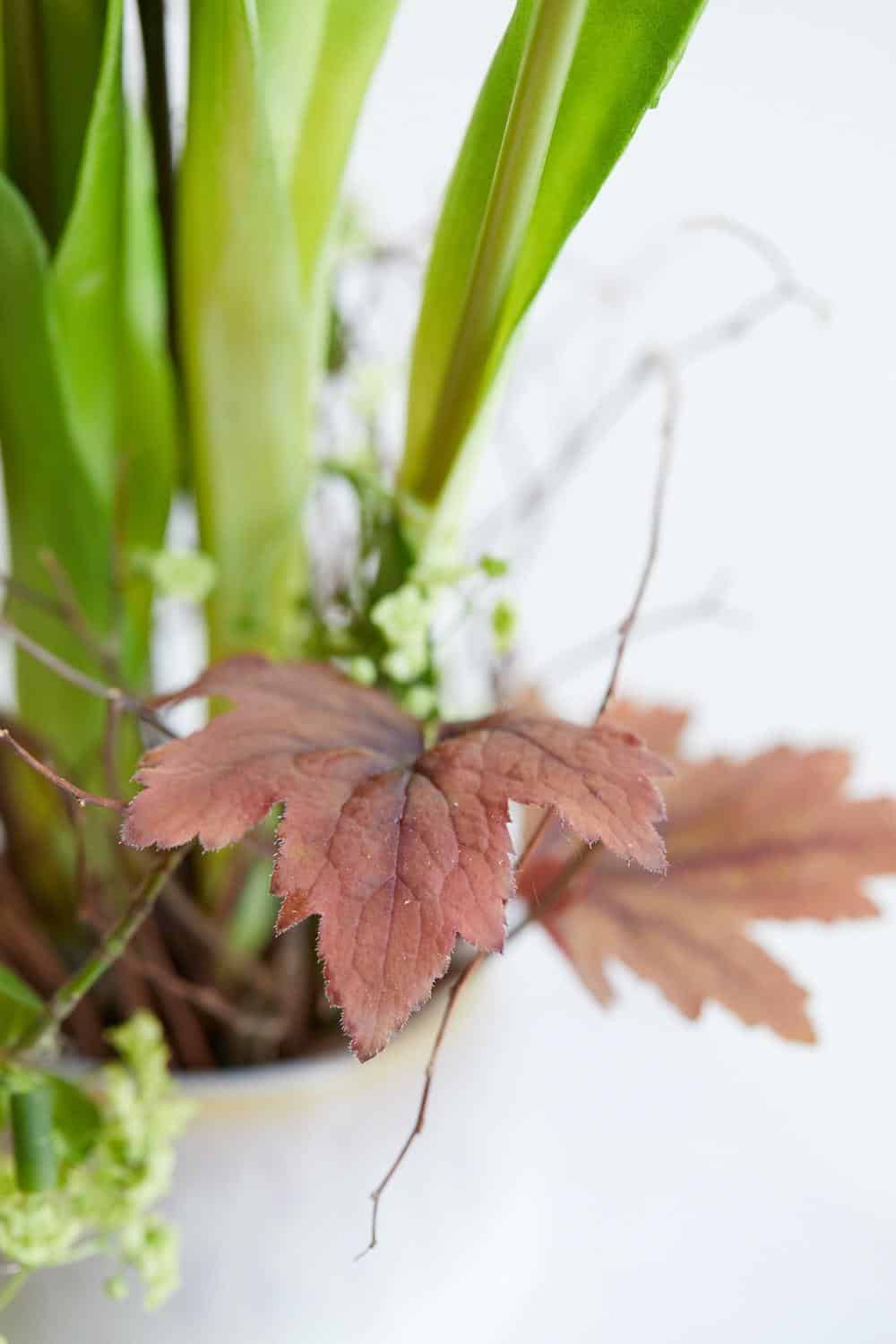 Da Tulpen in der Vase weiterwachsen, sind es die Bewegungen der knospigen Stängel, die in diesem Werkstück berücksichtigt werden. Geschnittene Trockenzweige geben den Tulpen Halt, dennoch muss ihnen genug Bewegungsfreiraum gelassen werden, damit sie ihre Hälse zum Licht recken können. Als farblichen Gegenpol werden sie von rötlichen Laubblättern des Purpurglöckchens umspielt.