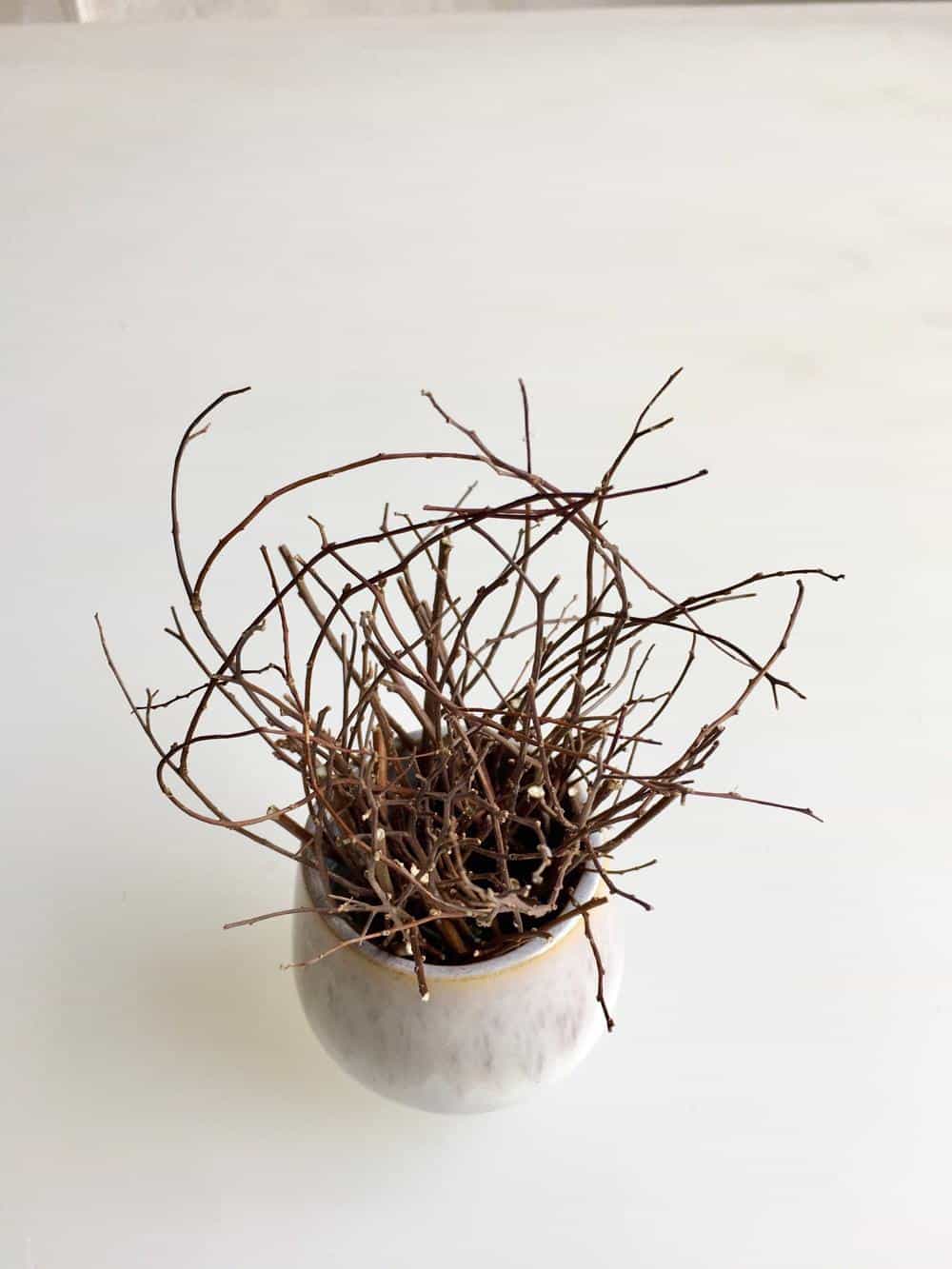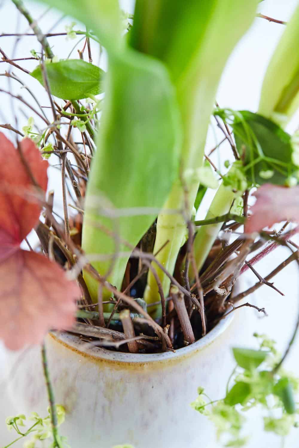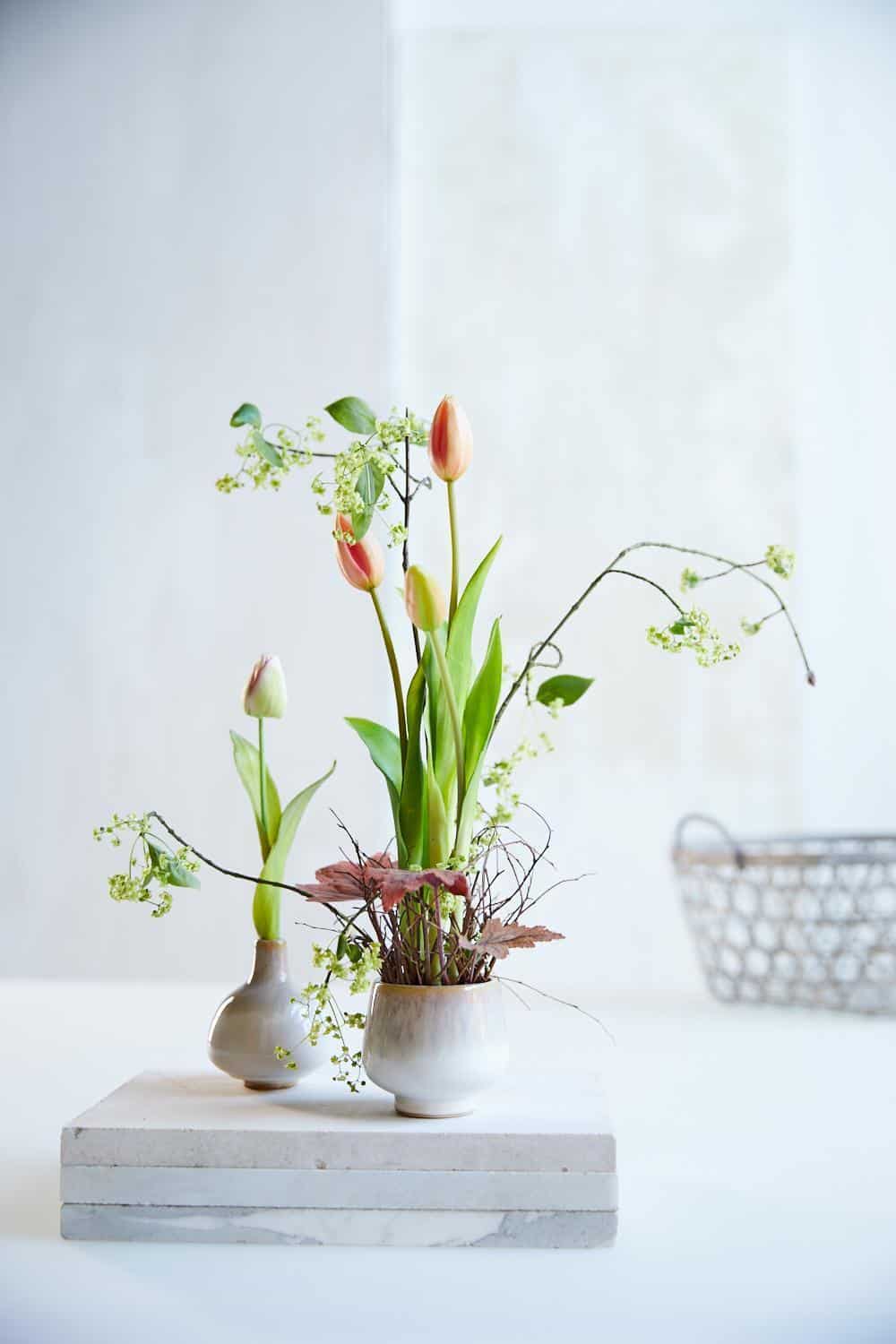 Aus einer natürlichen Steckbasis aus getrockneten Zweigen entspringen Tulpen und Pfaffenhütchen und entfalten den Frühling in seiner Einfachheit.