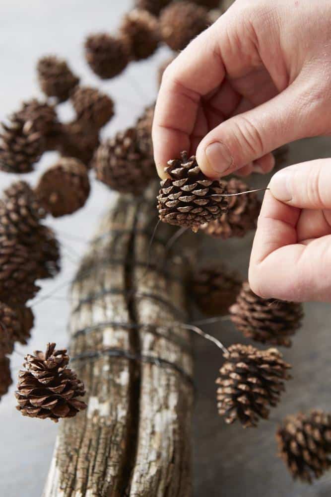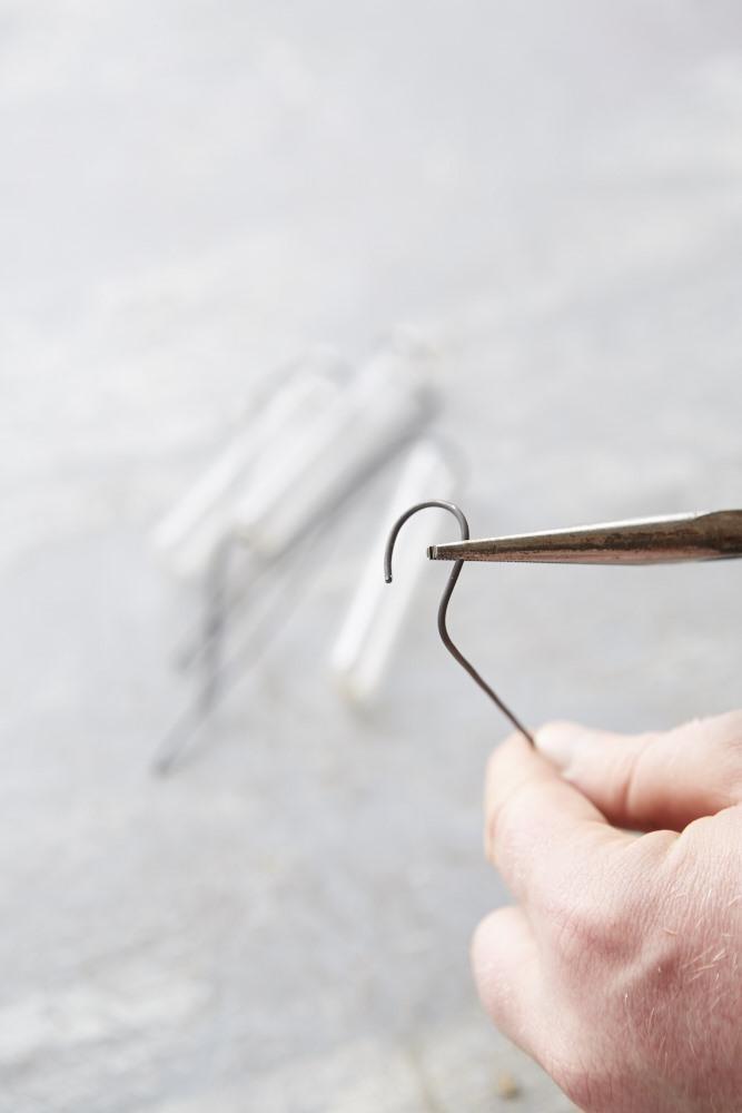 Wickeldraht an mehreren Stellen um den Stamm wickeln und an den Enden Zapfen andrahten. Öse aus Steckdraht biegen, in die das Glasröhrchen eingehängt werden kann. Ast anbohren, die Steckdrähte einstecken und Glasröhrchen einhängen, dieses mit Wasser füllen und Blüten einstellen. Zum Schluss Sterne einkleben.