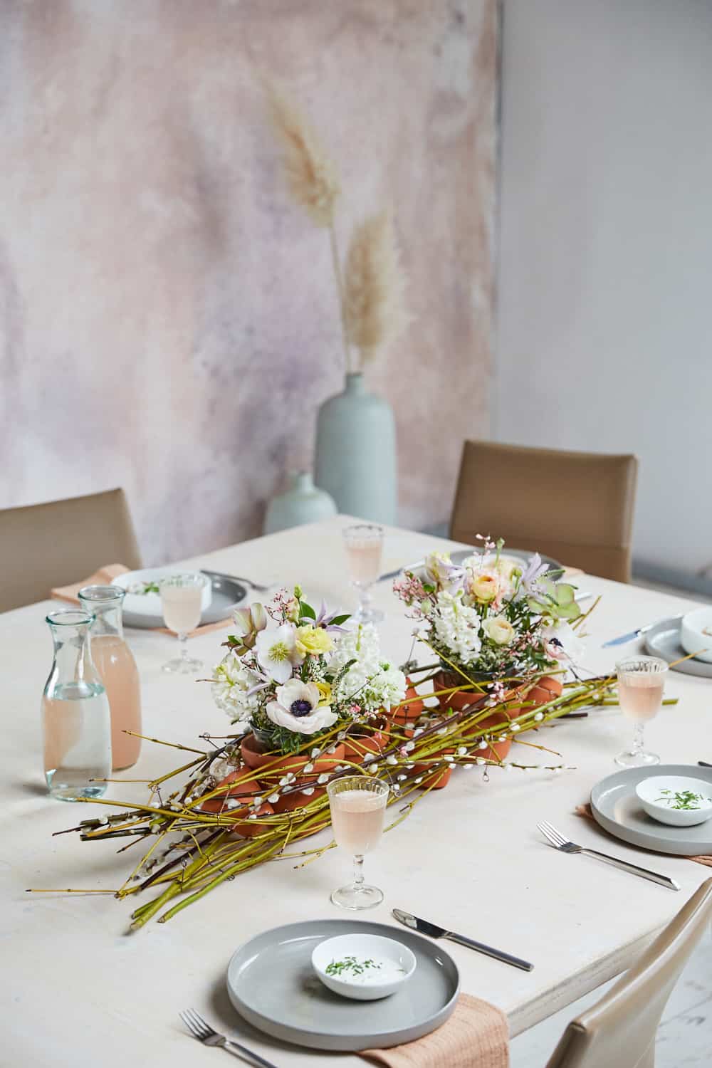 Der Ausgangspunkt aller Überlegungen zum Tischfries ist, natürlich, der Tisch selbst, seine Größe, seine Form, seine Farbe, das Material, die Tischwäsche, die ihn bedeckt. Das ist der Hintergrund, auf dem der Tischschmuck wirken muss. Hinzu kommen die Gedecke in ihrer Farbigkeit und ihrem Design sowie der gewünschte Platzbedarf. Wichtig sind auch die Bedürfnisse der Gäste – sie wollen genügend Platz haben, sich ungestört unterhalten können, essen und die Zeit genießen.