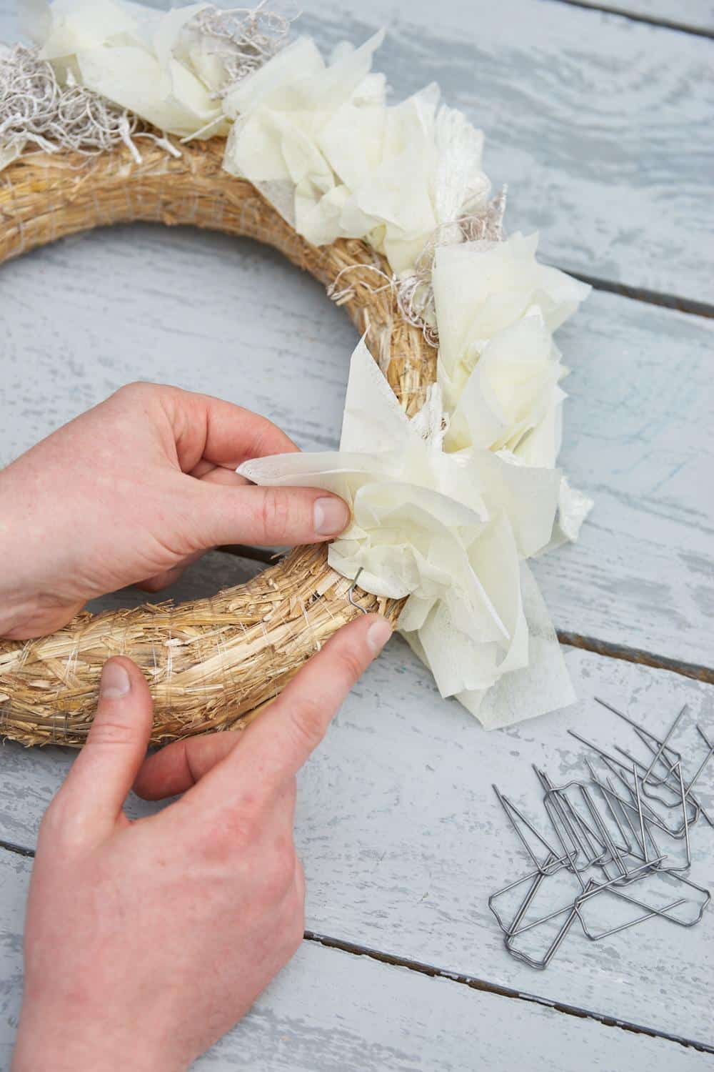 Strohrömer mit Vlies und Curley Moss behaften. Lunaria-Triebe einkleben. Den fertigen Kranz auf den Schalen rand auflegen und die Hortensie einpflanzen.