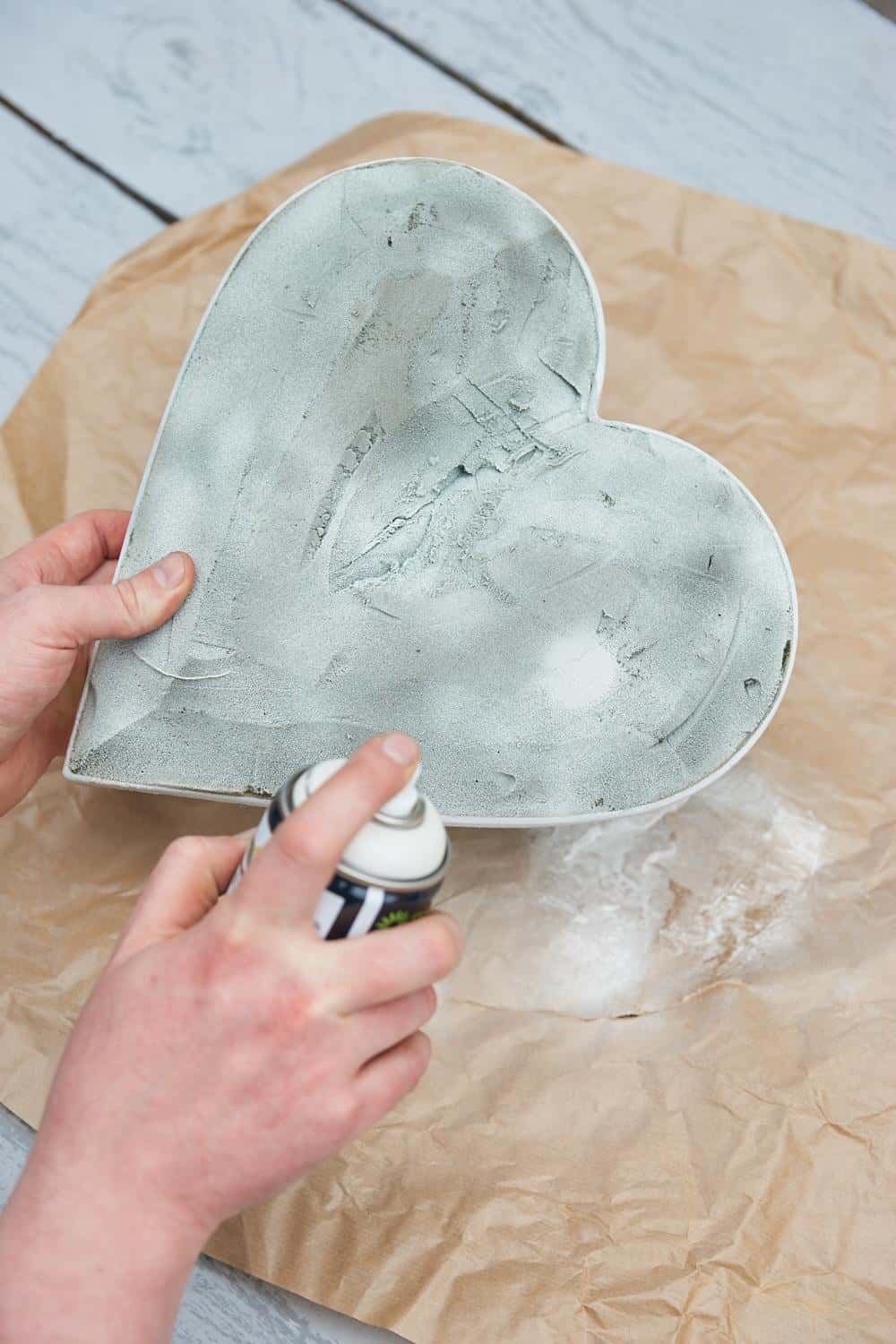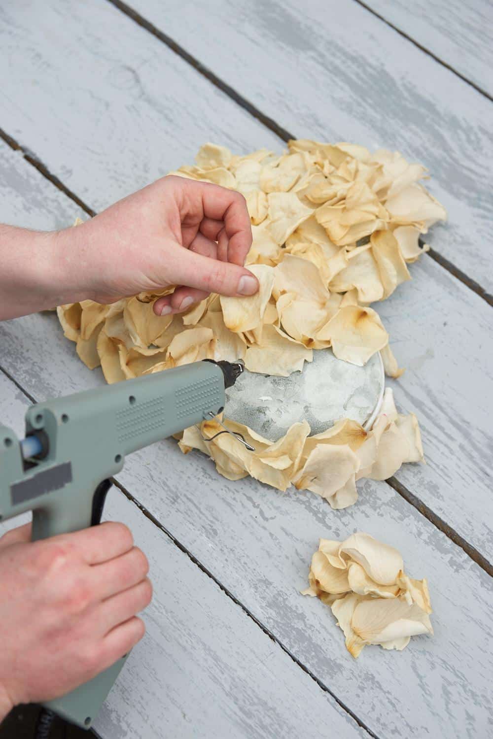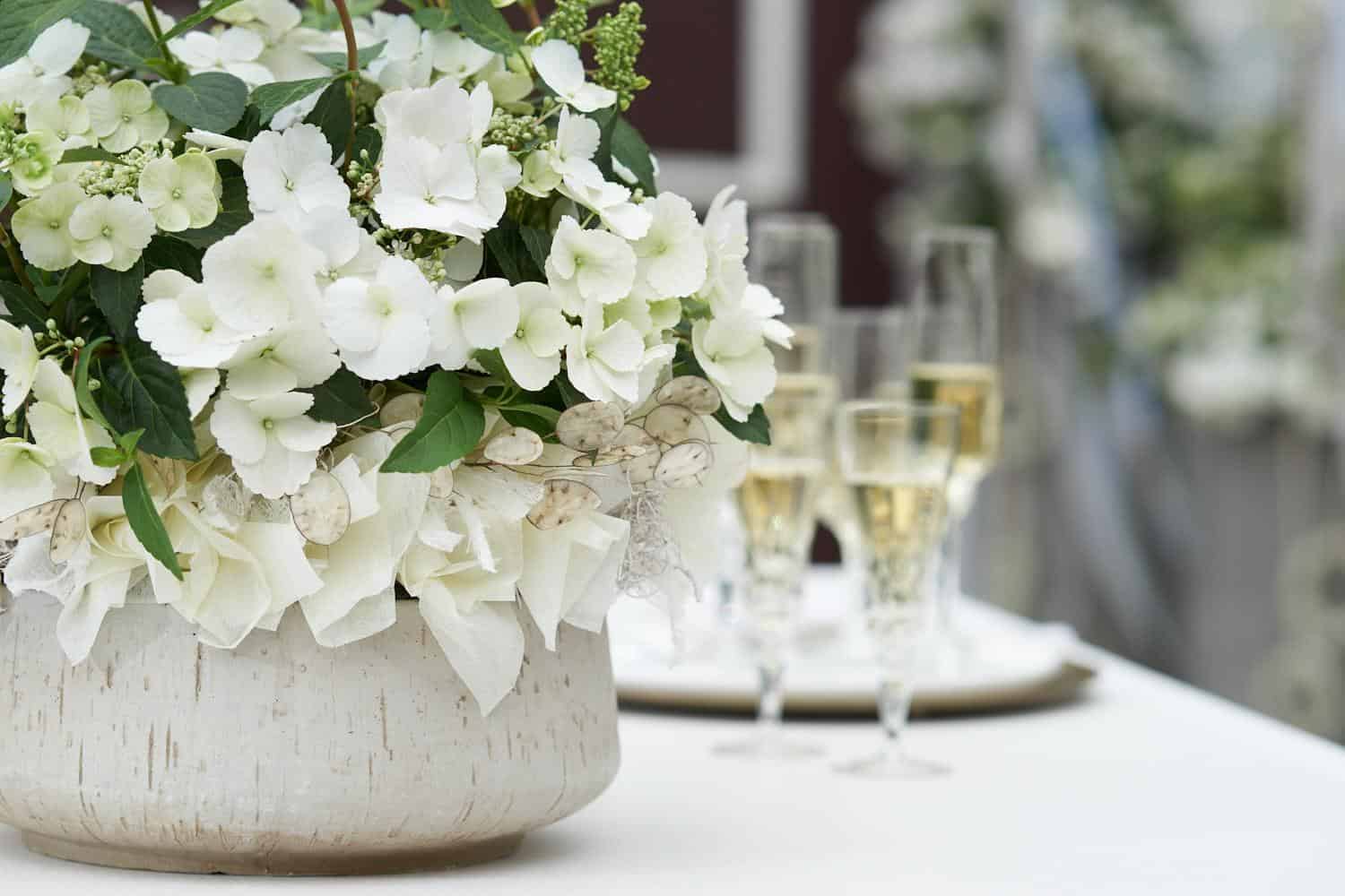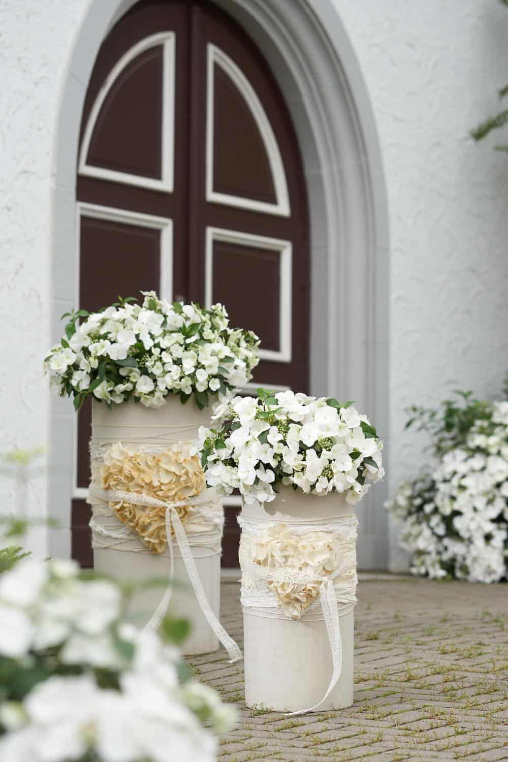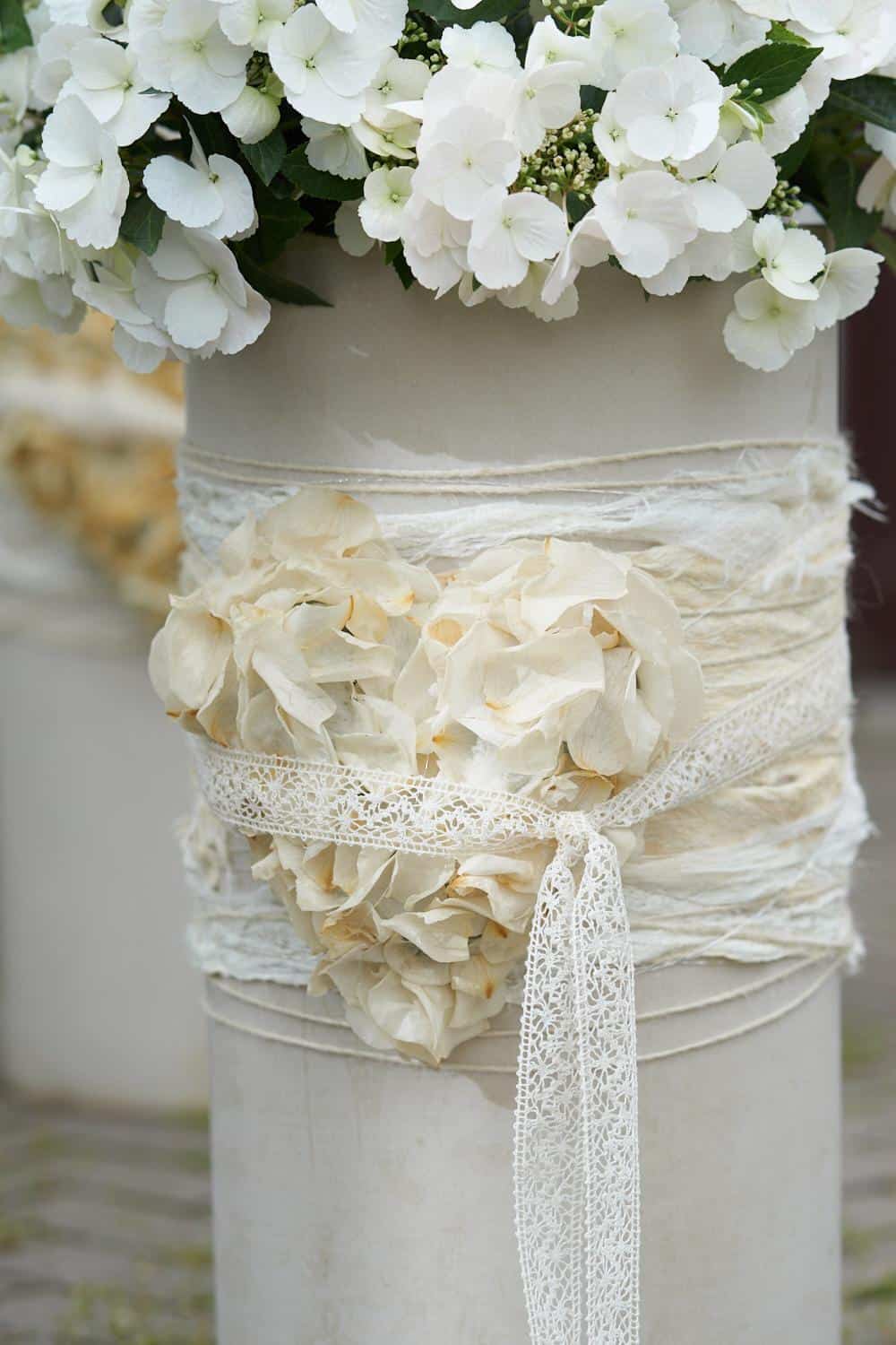 Frischblumensteckschaum-Herz weiß kolorieren. Gefriergetrocknete Rosenblütenblätter aufkleben. Das gestaltete Herz mit Bändern am Pflanzkübel anbringen und die Hortensie einpflanzen.