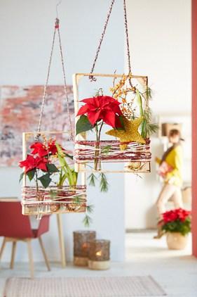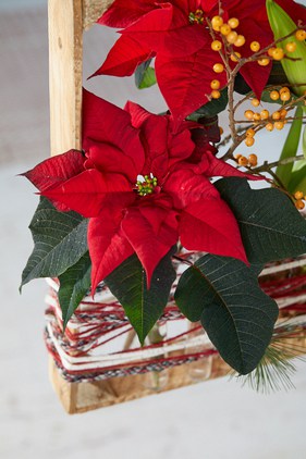 Den oberen Rand der Obstkiste absägen. An einer der schmalen Seiten Löcher für eine Aufhängung bohren. Dort Band einfädeln, zusammennehmen und zu einem Knoten binden. Den Holzkisten-Rahmen nun im unteren Bereich mit Bändern und Kordeln umwickeln. Glasröhrchen einklemmen, Wasser einfüllen und Poinsettia sowie Ilexbeeren einstellen. Ritterstern sowie Amarylliszwiebln und Bergkiefer in Wicklung einklemmen. Einen Holzstern mit gelb-goldener Schnur umwickeln und in Rahnen einhängen.