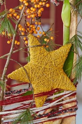 Ein Einmachglas mit Wolle bekleben und mit Zierdraht umwickeln. Dieses Glas mit Wickeldraht im Gestaltungsrahmen befestigen. Wickeldraht mit Schnur kaschieren und Clematisranken in den Reifen winden. Mit Rödeldraht fixieren. Den Weihnachtsstern in das Glas einsetzten, mit Wasser füllen sowie mit Bändern und Kugeln dekorieren.